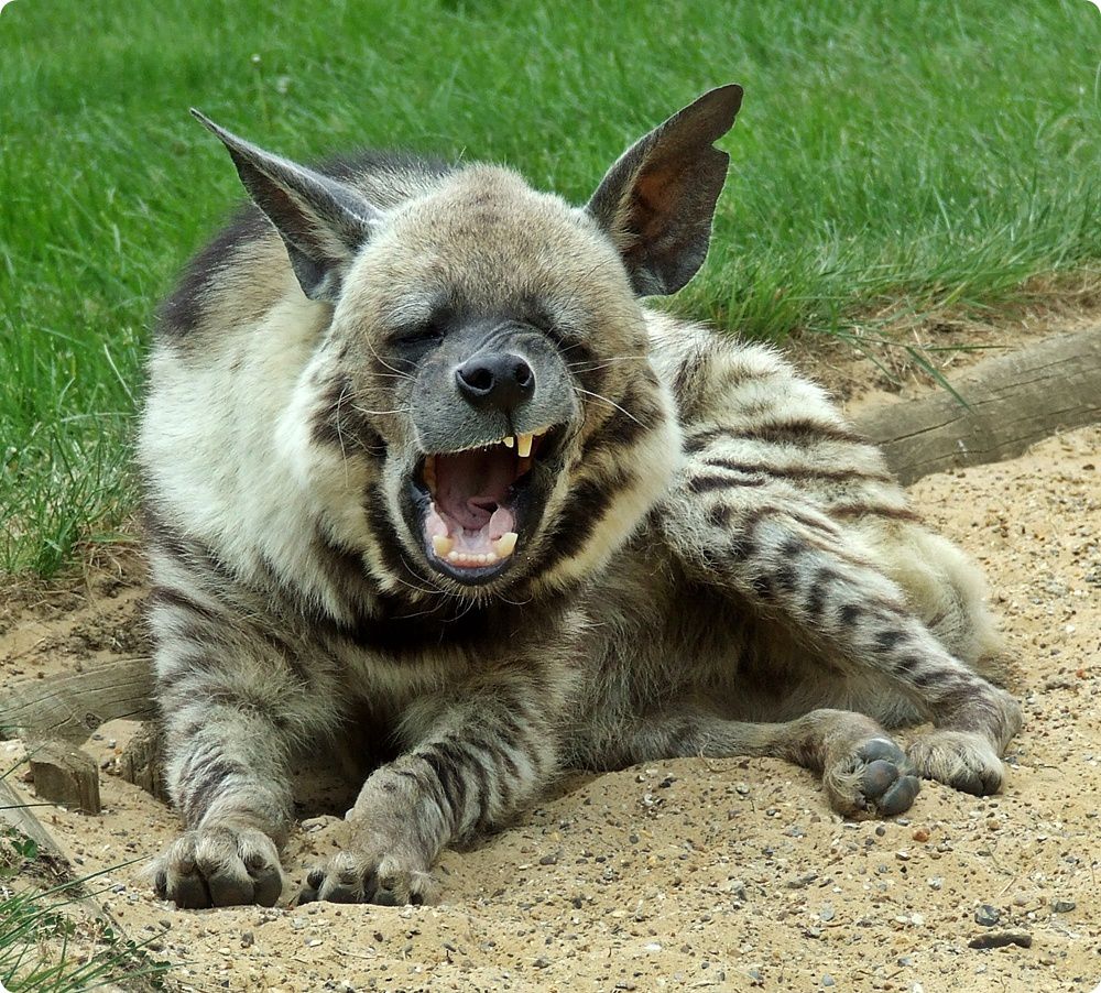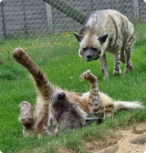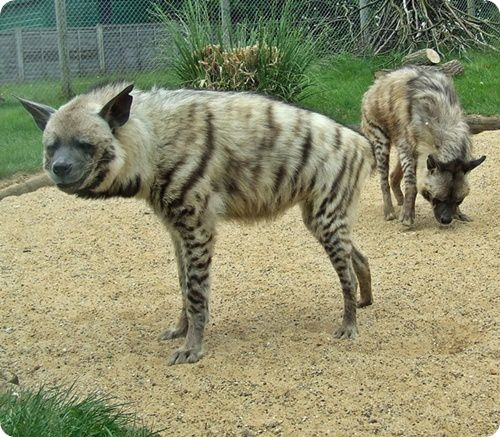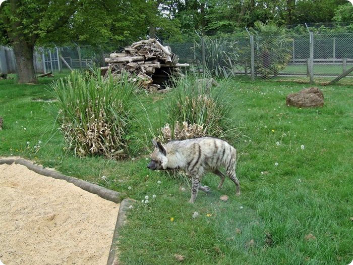 A velük átellenes oldalon egy nagyobb testű ragadozó, a csíkos hiénák terjedelmes kifutója található.