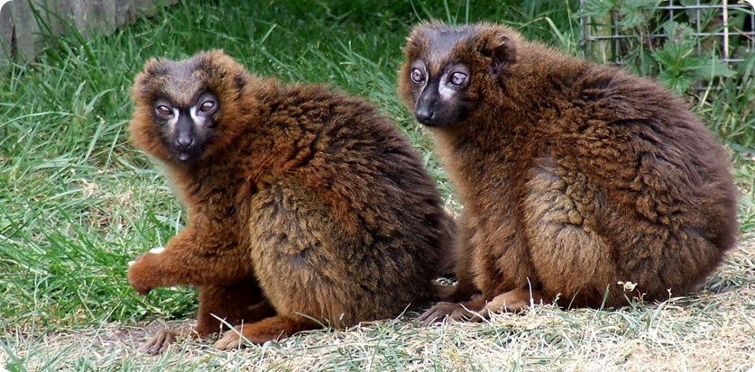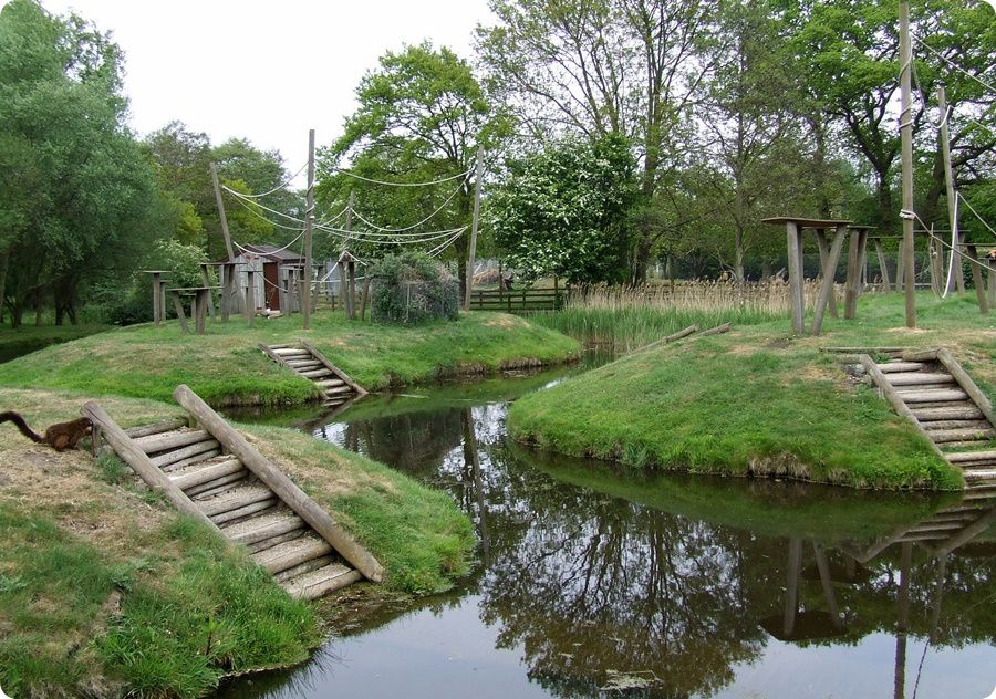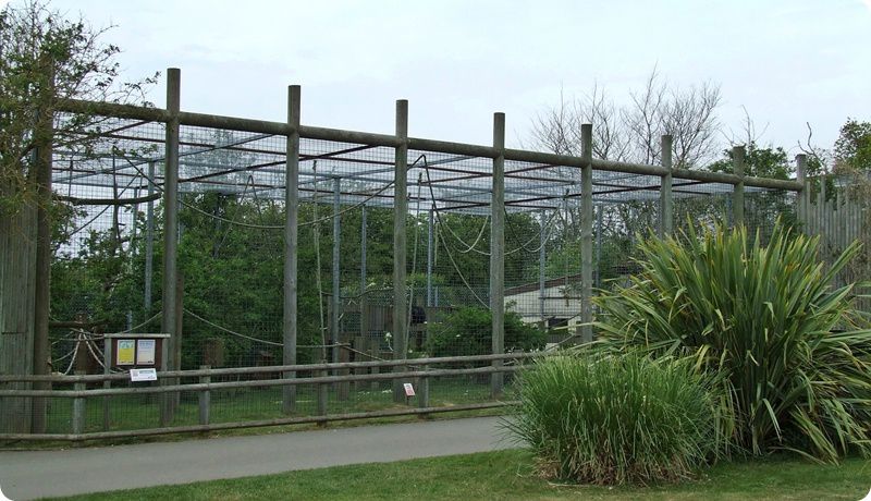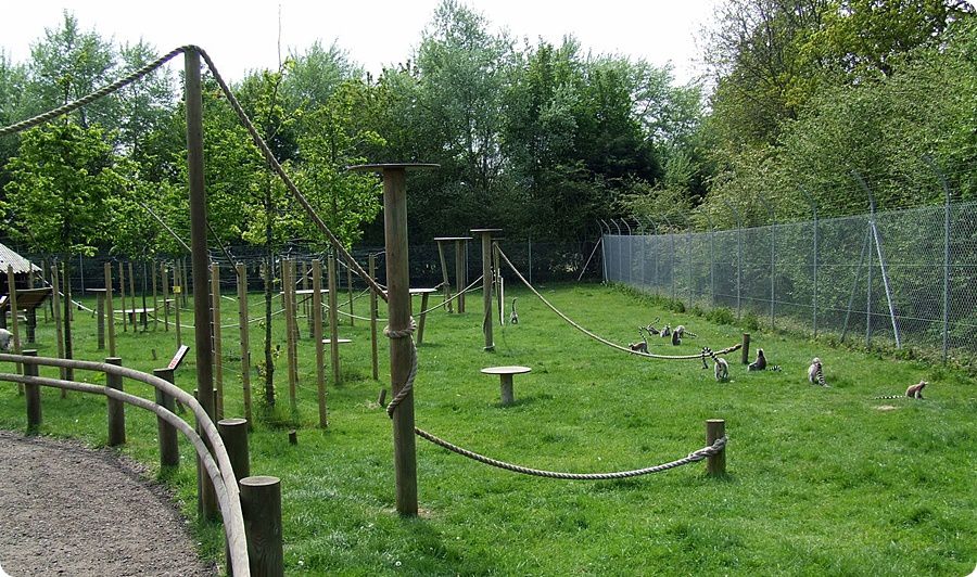 A kattákhoz a látogatók is besétálhatnak (balra), csimpánzketrec (jobbra)