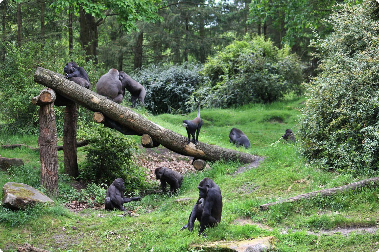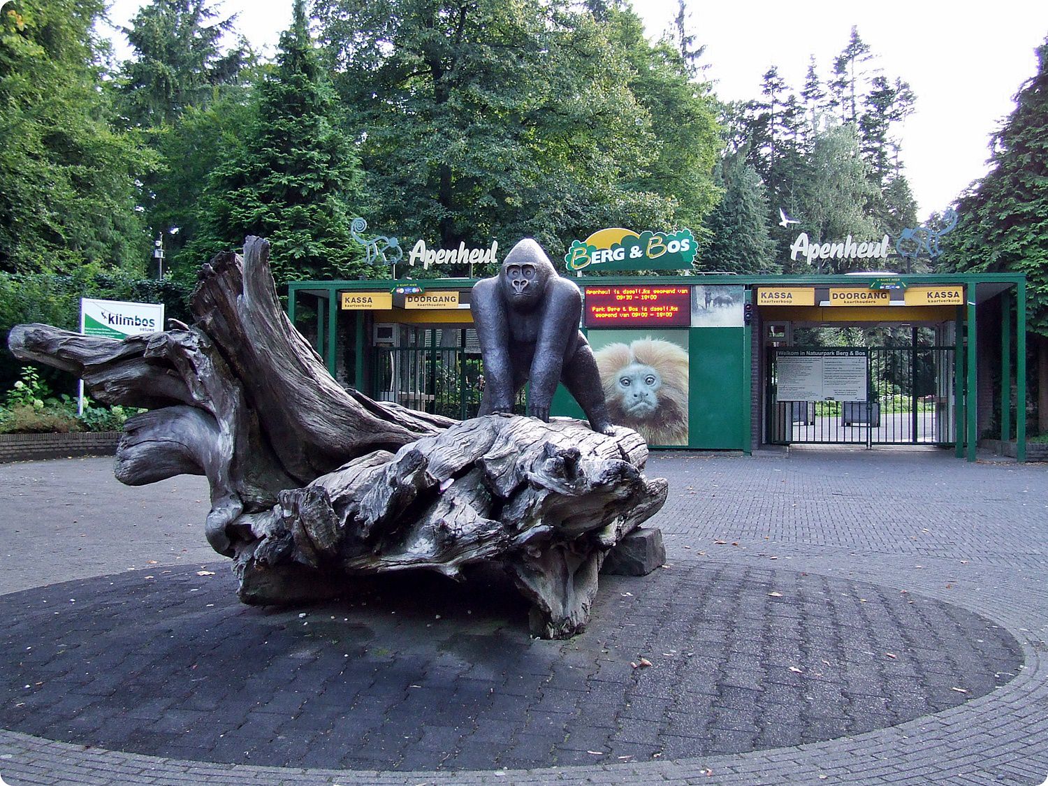 Apenheul egyik kulcsfaja a nyugati síkvidéki gorilla, melyet a Natuurpark Berg & Bos bejárata előtti gorillaszobor is híven tükröz. Az alsó felvételeken az intézmény bejárata látható.