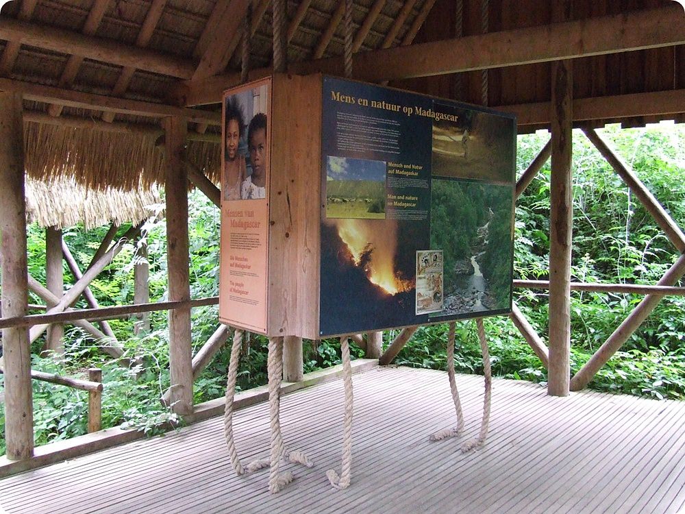 Az eső-beállóként is funkcionáló malagaszi-kunyhók méretes és színvonalas tablói részletes ismeretszerzést tesznek lehetővé Madagaszkár élővilágáról és a szigetet veszélyeztető folyamatokról egyaránt.