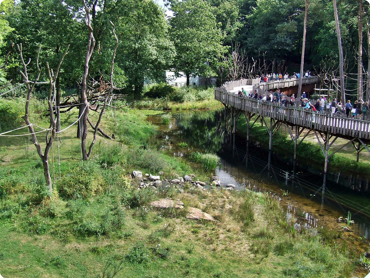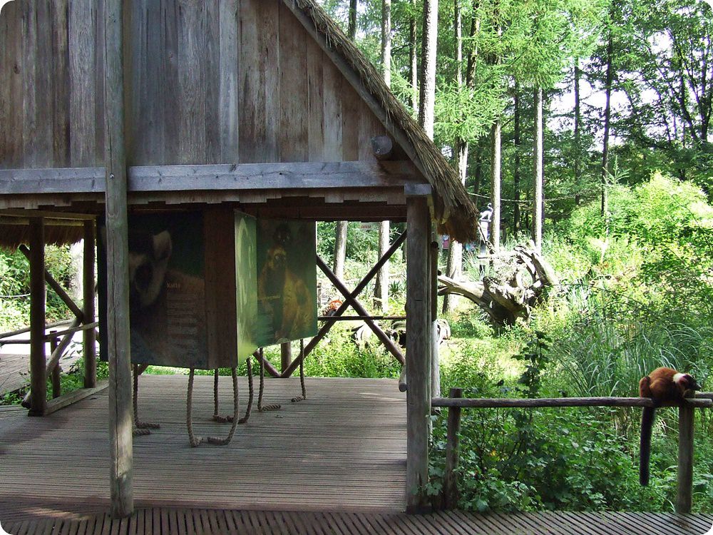 Az állatkert térképére pillantva láthatjuk, hogy a főemlősök vizesárokkal határolt kifutókon, illetve szigeteken kerülnek bemutatásra. A férőhelyek szinte minden esetben igen tágas, természetes erdei környezetet jelentenek, ahol többnyire türelem, illetve némi várakozás szükséges az állatok aljnövényzetben vagy lomkoronában történő felfedezéséhez. A szemlélődést természetesen megkönnyíti számunkra a bemutatóhelyeken napjában többször megtartott etetéssel egybekötött előadás, mely prezentációra az erdő távolabbi pontjairól is egy helyre gyűlnek a kíváncsi és éhes állatok.