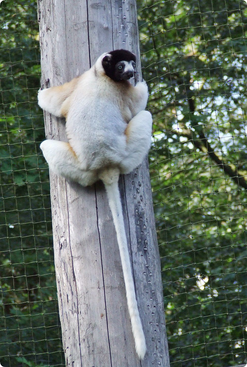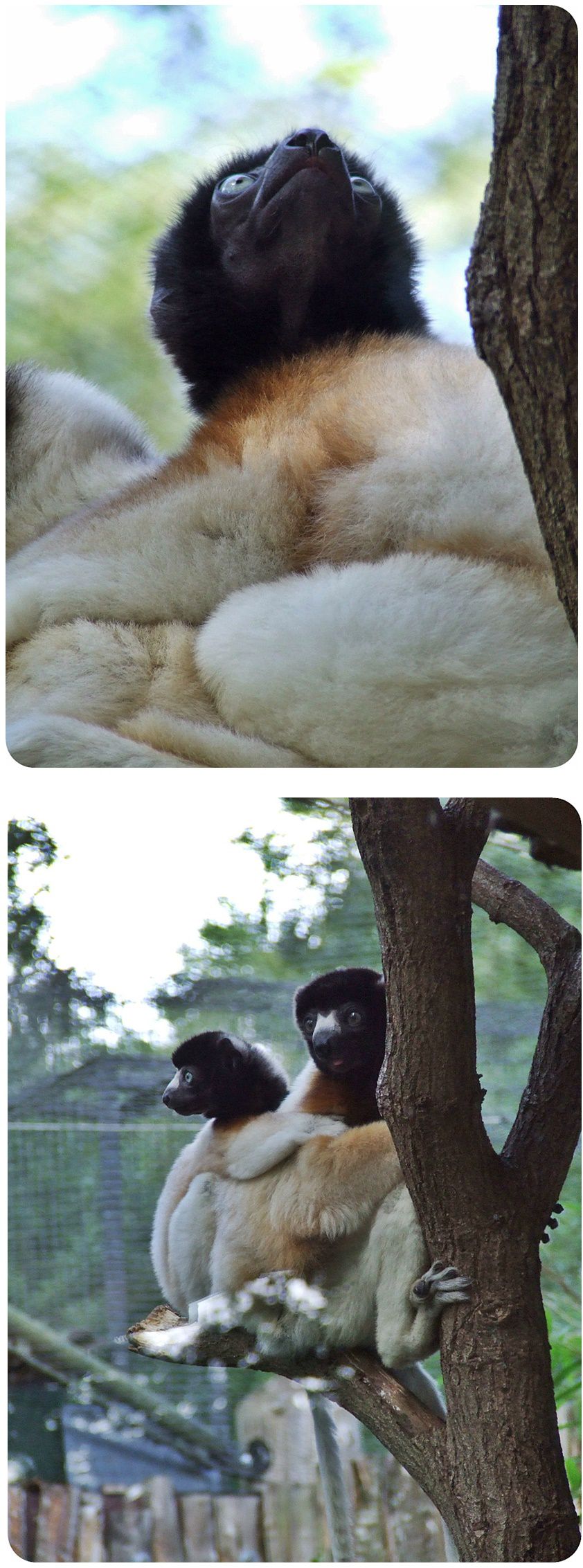 A bal szélső, 2009-es felvételeken Daholo, Apenheul „elsőszülött” koronás szifakája, az alsó fotón pedig a szifakák, bambuszmakik és keselyűfejű gyöngytyúkok (Acryllium vulturinum) közös férőhelye látható.