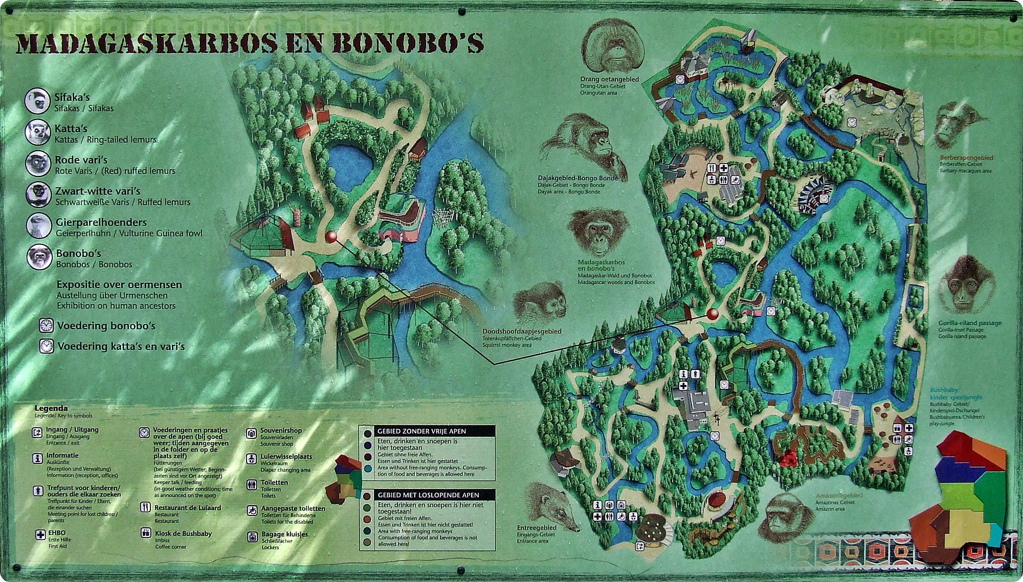 Az állatkert számos pontján találkozhatunk a park térképét igényes kivitelezésben megjelenítő nagyméretű táblákkal. Ötletes megoldás, hogy az éppen aktuális lokációt nagyításban is átmustrálhatjuk a könnyebb áttekinthetőség érdekében, továbbá külön feltüntetésre kerülnek az itt bemutatott fajok egyaránt . A fenti felvételen a Madagaszkár-zóna és a bonobók területe látható.