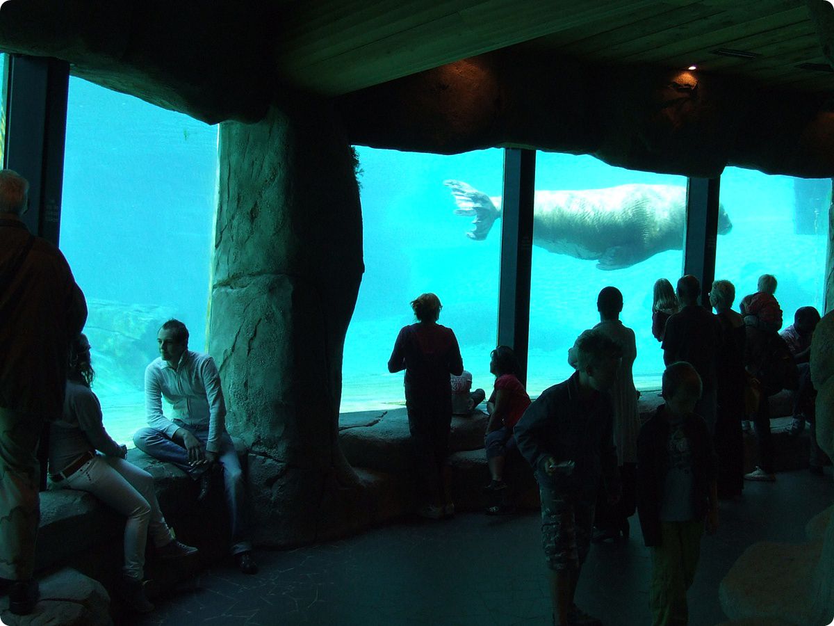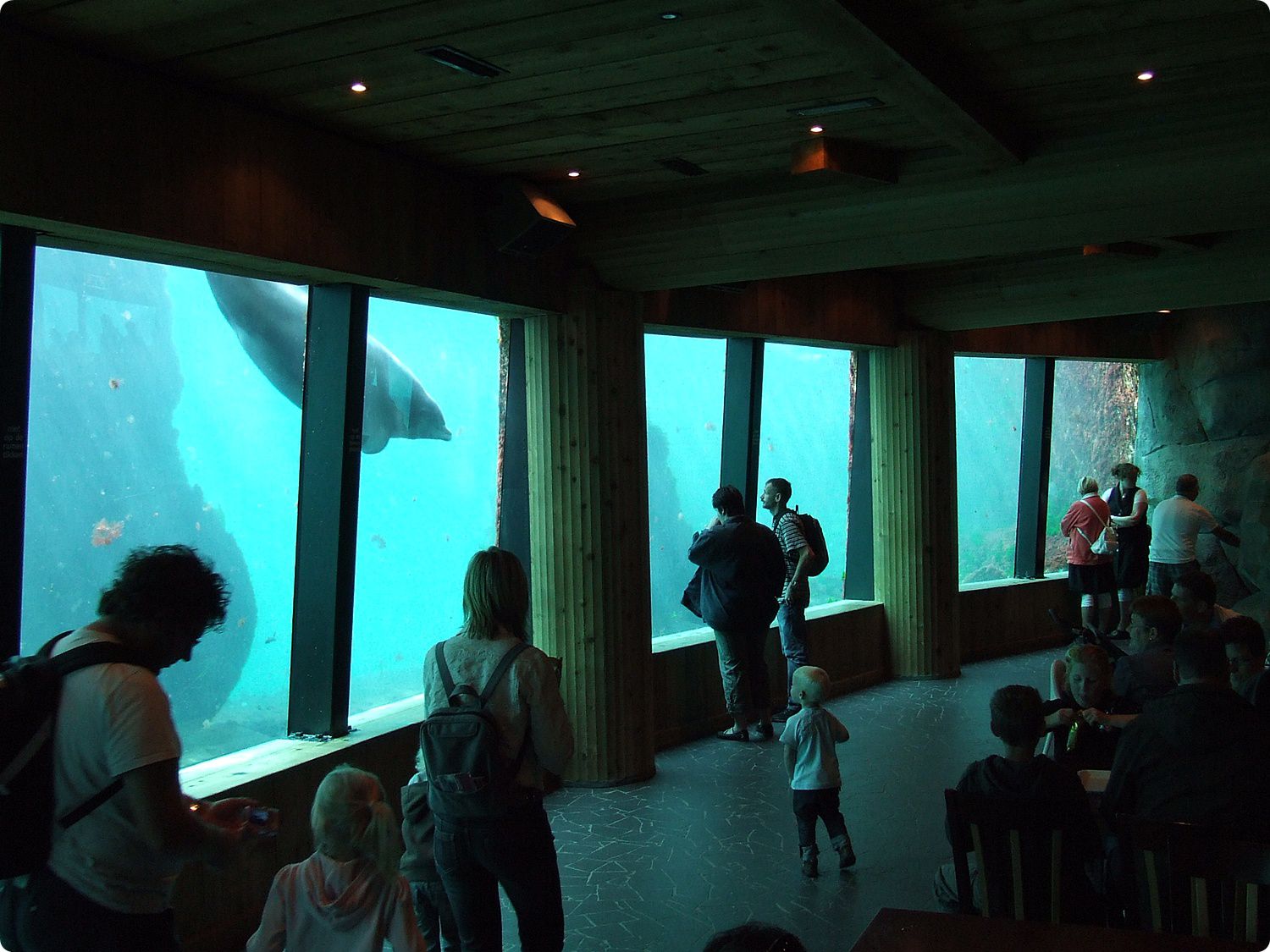 A bemutatók megtekintése után érdemes még elidőzni a területen, a lagúnalakók ugyanis üvegfalon keresztül is megtekinthetőek. A rozmárok férőhelyének egyik oldala mentén, a Delfindelta középső részénél található épületen át juthatunk a föld alá mélyített bemutatóegységbe. Az itt kialakított étterem mentén egy 60 méter hosszú üvegfal húzódik, amelyen keresztül a borjaikkal úszó palackorrú delfinek és rozmárok káprázatos víz alatti birodalma tárul elénk. Táblák már a szintek között gyakran közlekedő nagyméretű liftben felhívják a vendégek figyelmét a csendes, kulturált viselkedésre és a vakuhasználat tilalmára, hiszen nagyon fontos az utódait nevelő delfincsapat életének zavartalansága.