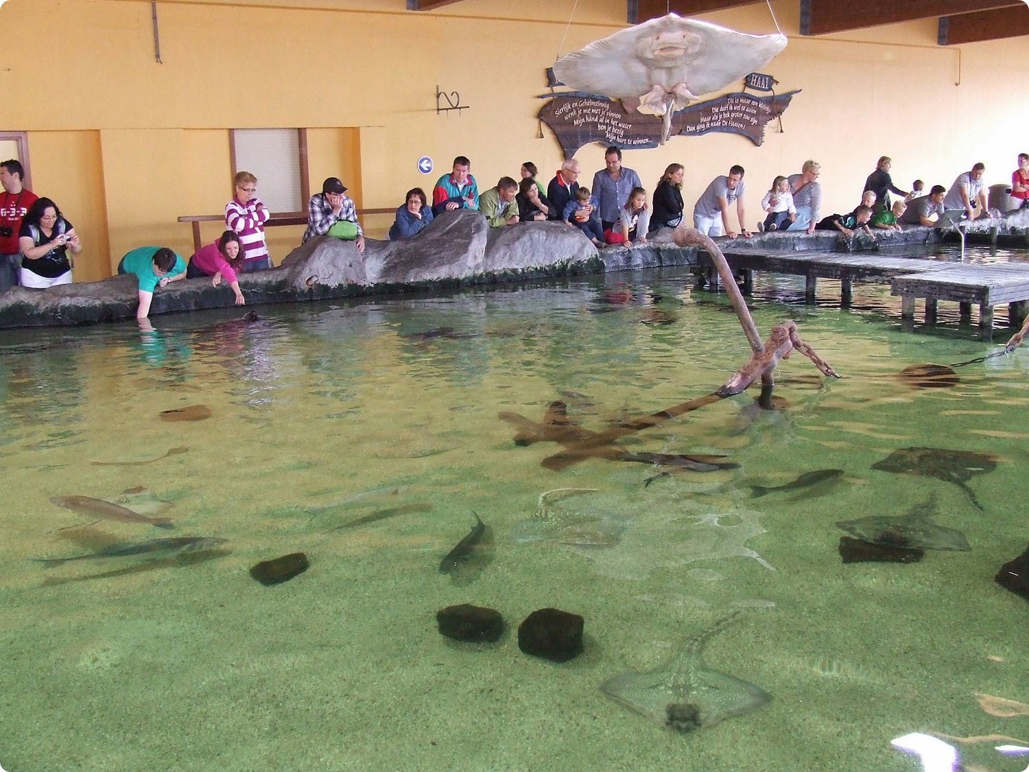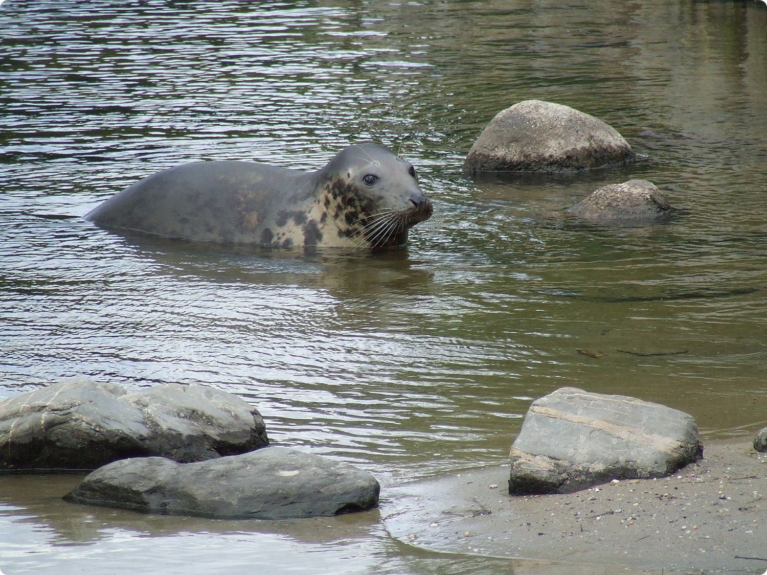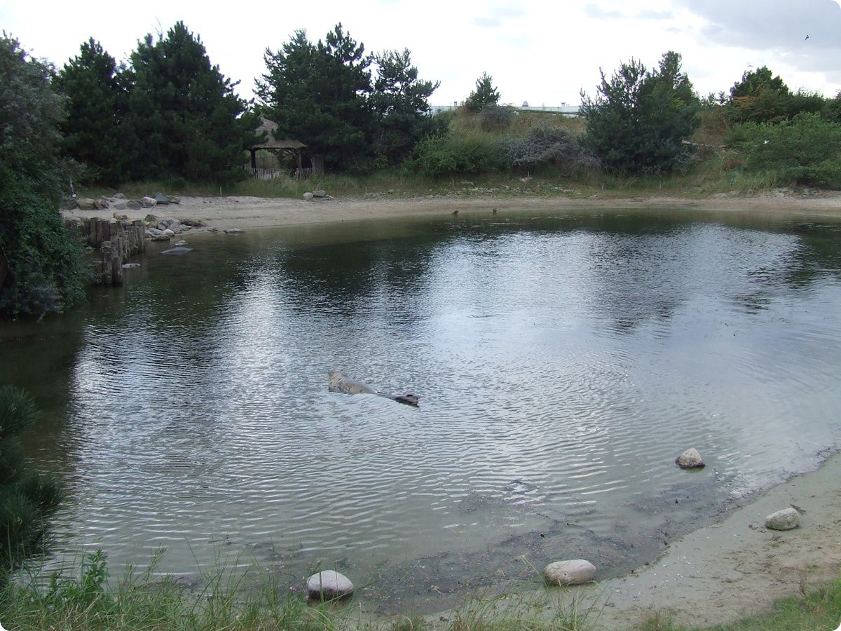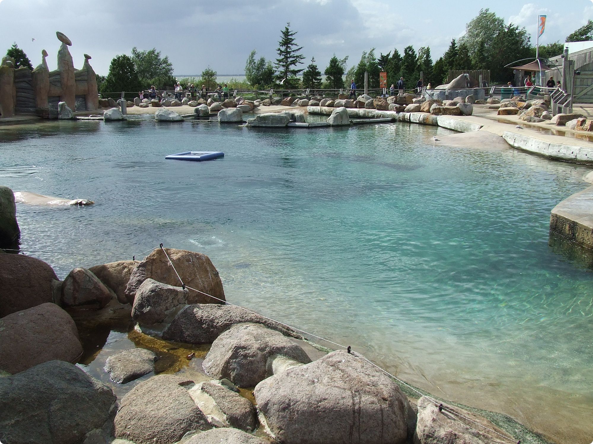 A lagúnabeli élményekkel feltöltődve a park egy egészen más kiépítésű részére érkezünk. A homokdűnék között kanyarogva két európai elterjedésű fókafaj nem szokványos bemutatóiba botlunk. A kúpos fókák (Halichoerus grypus) a nyári meleg enyhítésére terjedelmes, homokos partú tavukban hűsölnek, a borjúfókák (Phoca vitulina) szintúgy. Előbbiek egy leshelyként szolgáló kis faépítményből is megtekinthetőek, bemutatójukat elhagyva pedig egyenesen a tengerpartra sétálhatunk. Érdemes azonban nem túl sokat elidőznünk itt, hiszen nem messze található a park „állatsimogatója”. Ez természetesen csak részben helytálló megnevezés, de való igaz, hogy az Északi-tenger halfajait bemutató, csarnok méretű, alacsony falú medencében bizonyos halak könnyedén megérinthetőek. Az intézmény e szegletében található még a gyerekek számára programot kínáló két épület, ahol 4D-filmvetítés és egy oroszlánfókákkal tartott játékos előadás várja az ifjú látogatókat.