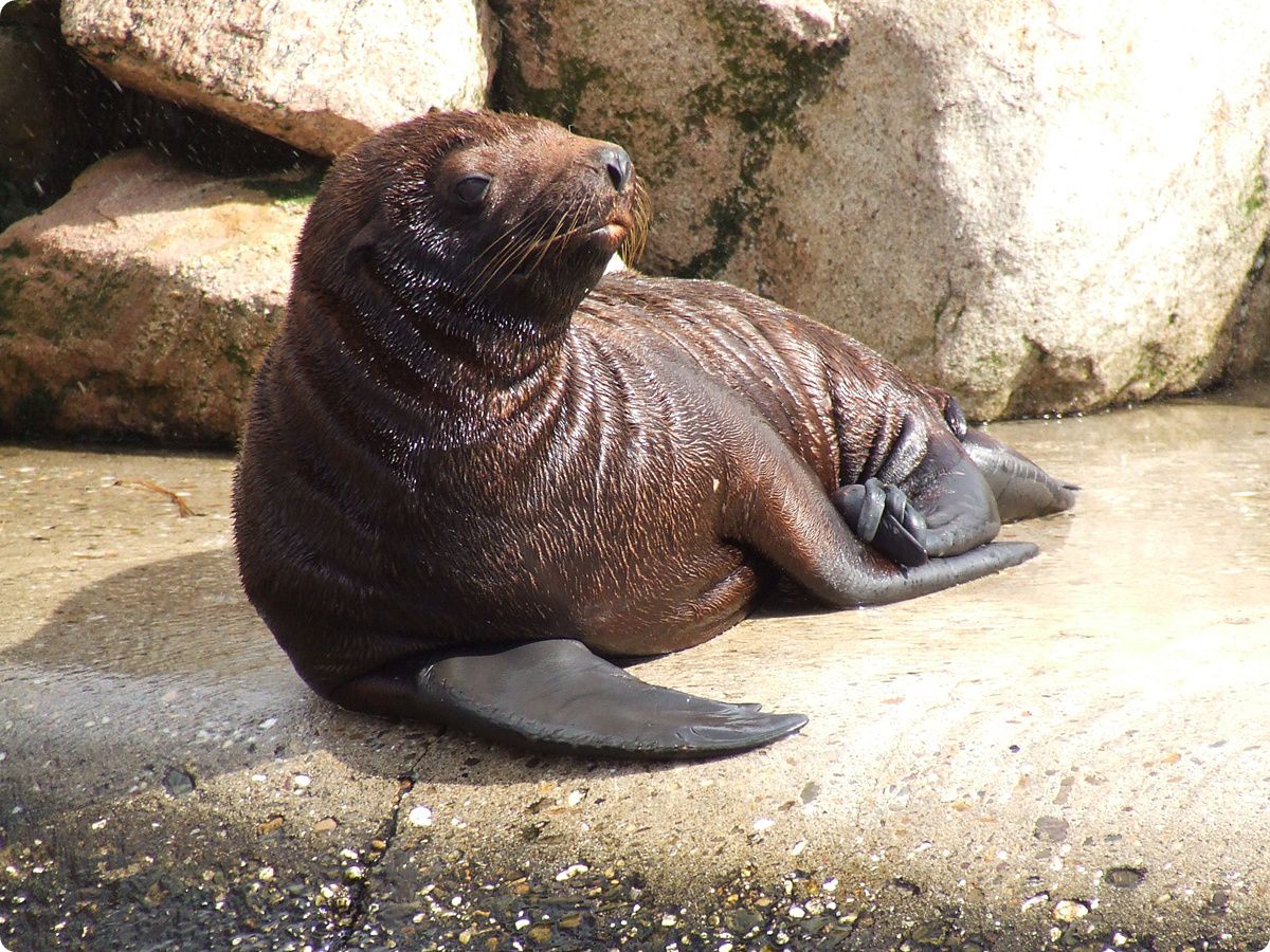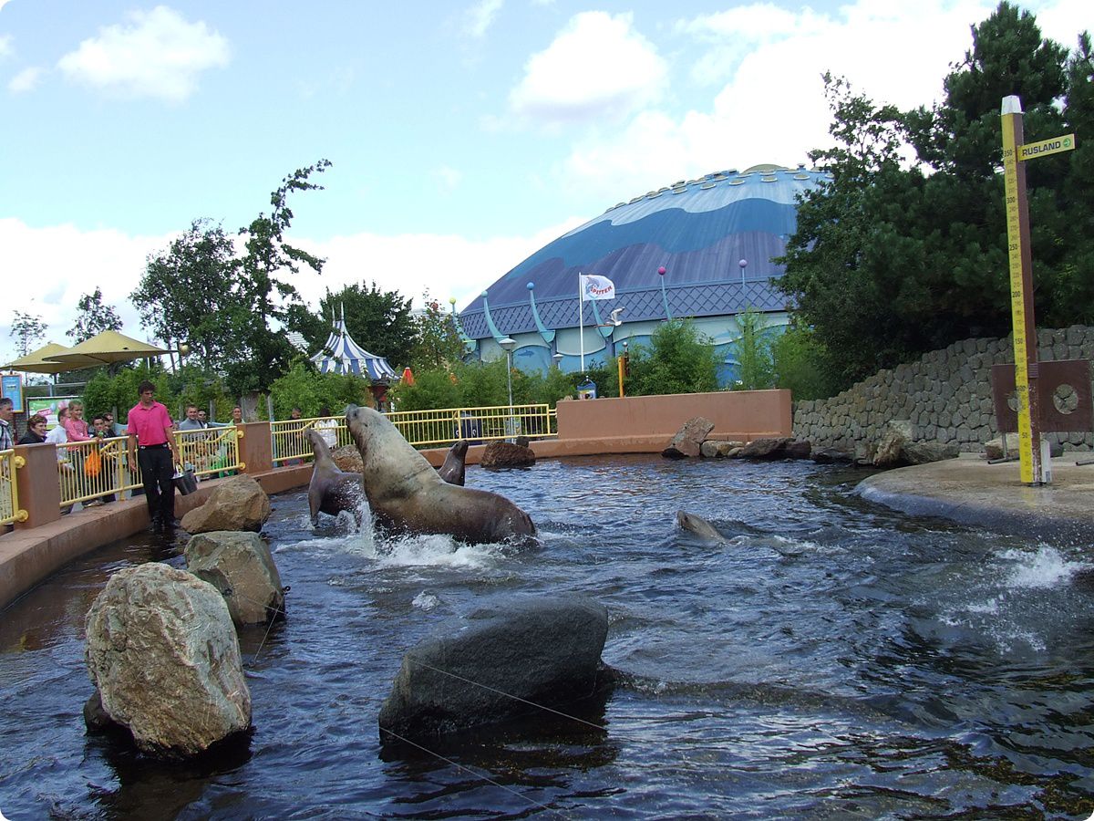 A bejárathoz közeli egyik bemutatóban az állatkertekben csak elvétve látható, veszélyeztetett fókafaj köszönt bennünket. Az északi vagy Steller-oroszlánfókákról (Eumetopias jubatus) van szó, amelyek a fülesfókák legnagyobb fajának képviselői. A velük szomszédos medencében közönséges disznódelfinek (Phocoena phocoena) úszkálnak, melyek a legkisebb cetfélék közé tartoznak. Érdemes megemlíteni, hogy az Európai Állatkertek és Akváriumok Szövetsége (EAZA) a 2010-es esztendőre is meghosszabbította az Európai Ragadozókért Kampányát (EAZA European Carnivore Campaign), így annak eredeti 12 kulcsfaja további néggyel bővült, melyek egyike éppen a közönséges disznódelfin.
