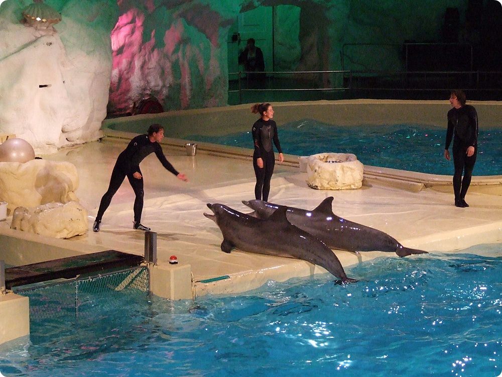 A szórakoztató show-elemeket tartalmazó delfinbemutatók játékos produkciói a delfináriumok legnagyobb attrakciójának számítanak, és létjogosultságukat illetően jelentősen megosztják a véleményeket.