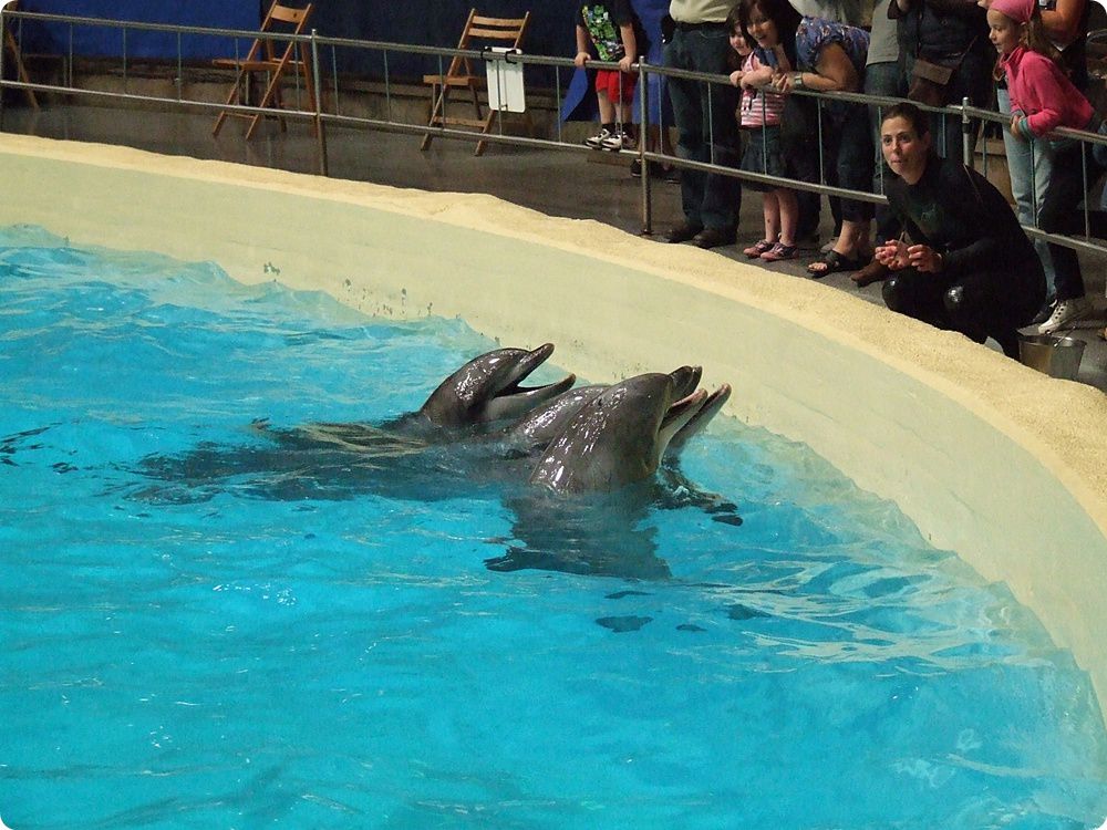 A fókák speciális tréningje nagy népszerűségnek örvend a látogatók körében (balra). A disznódelfinek tréningje - a többi bemutatóhoz hasonlóan - kb. 15 percig tart. Jelenlegi férőhelyük (jobbra) korábban rozmármedenceként funkcionált.