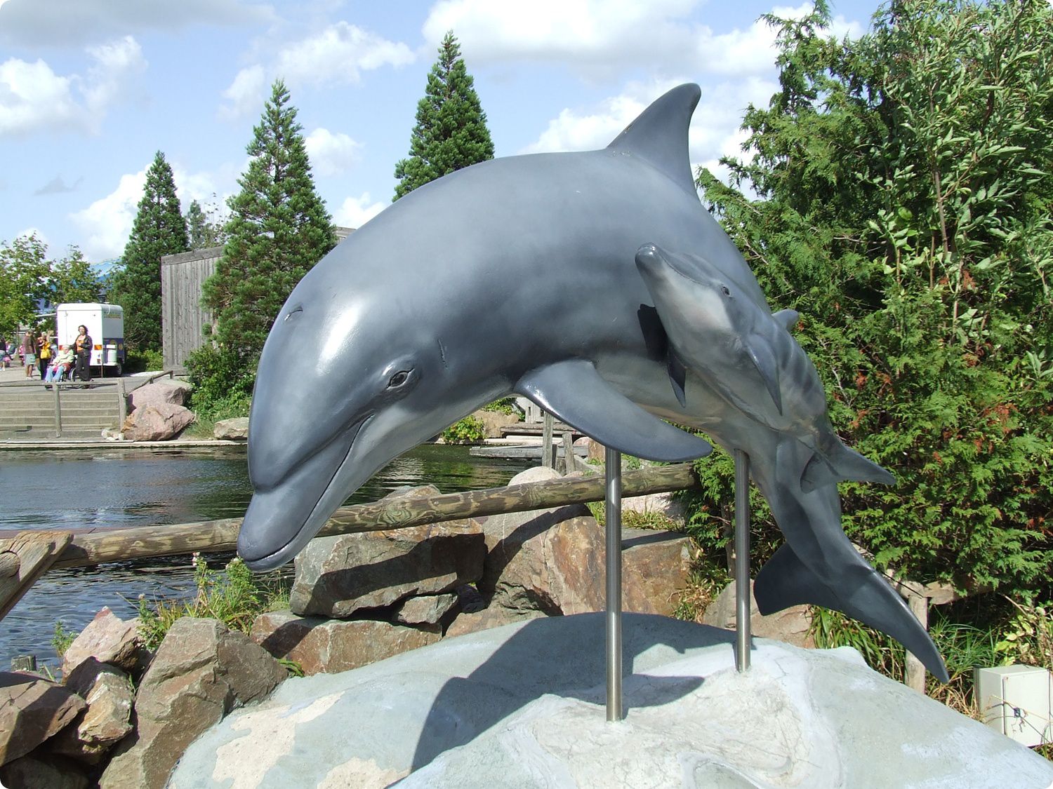 A Delfinlagúna partján elhelyezett élethű delfinszobor (balra). A park egyéb információs egységei - mint pl. ez a valódi és fülesfókákat összehasonlító panel - szintén rendelkeznek az említett bélyegzővel (jobbra).