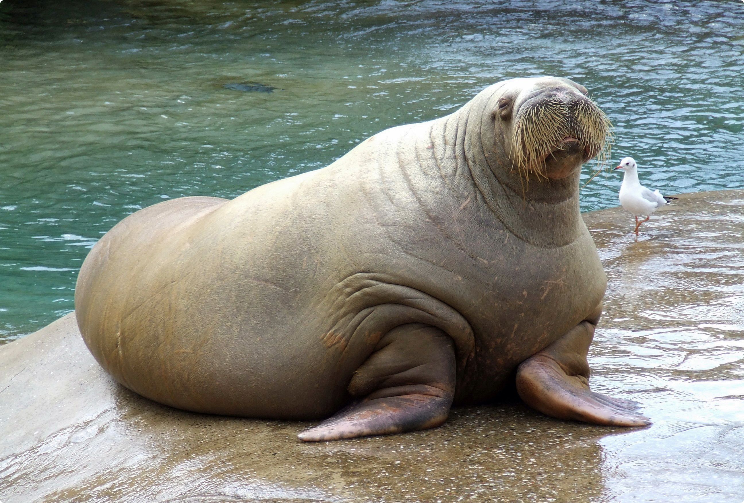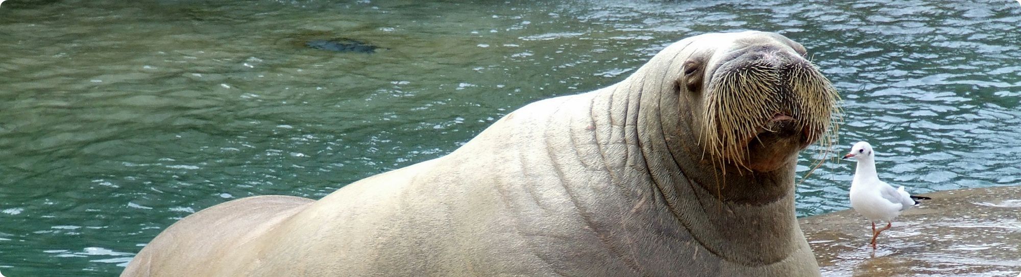 Az impozáns Rozmárház (balra), melyet a jobb oldalon látható elkülönítő medencéken keresztül közelíthetnek meg az állatok. A rozmárok látványos show-ja napi három alkalommal kerül megrendezésre. Ennek kezdetén a bemutató nehézsúlyú sztárjai zenére vonulnak ki férőhelyük szárazulatára (jobbra).
