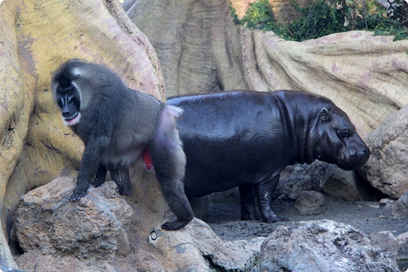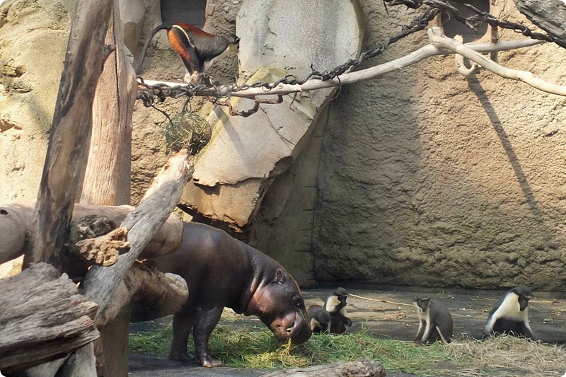 In the Tropic World Africa exhibit of Brookfield Zoo a Pygmy Hippopotamus (0.1), Talapoin Monkey (various groups), Sykes’s Monkey (3.2), Red-tailed Monkey (1.3), Sooty Mangabey (1.4), Red-capped Mangabey (5.0 or 4.0 or 2.0), Mandrill (1.3), Guereza (3.4) and birds (23 species) were successfully mixed for 16 years. Hippo was always introduced first to new primate species. The institution has only ever maintained one female hippo at a time, but has had three different hippos there from 1982-2012. The addition or removal of primates had no consequence to that of the hippopotamus at the time. The staff had no problems with hippos, but from time to time the monkeys – i.e. Red-capped Mangabeys – harassed the Pygmy Hippo mildly to which she would go back to the pool until the monkey lost interest. In general, all primates and the hippo coexisted without problem. The institution did not stop exhibiting the hippo in this exhibit for lack of success: the management decided to exhibit the species in just one area of the zoo so the Pygmy Hippopotamus has been moved to the Pachyderm House in 2012 (AZA Ungulate TAGs 2017).