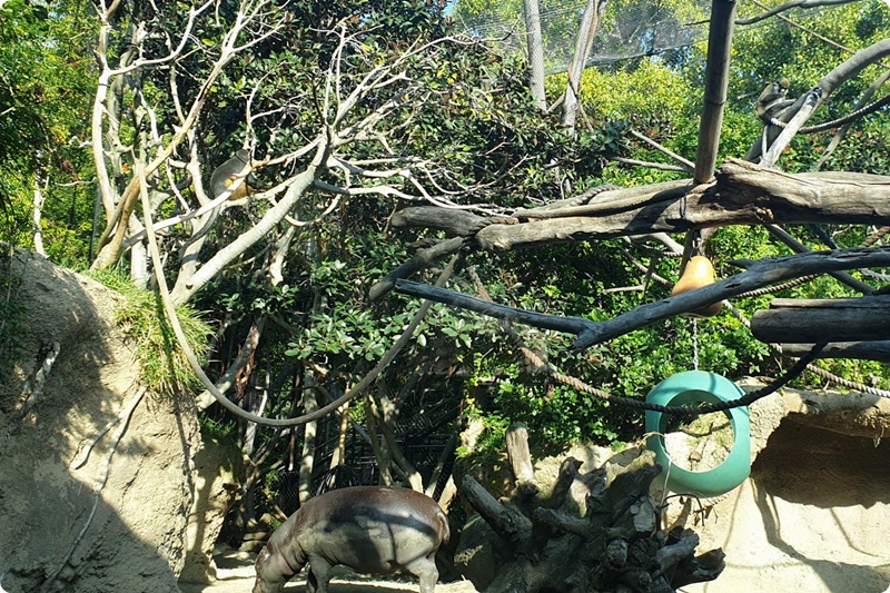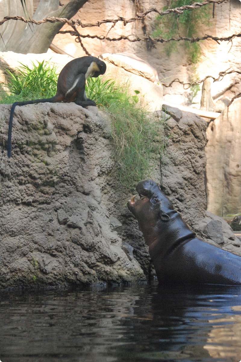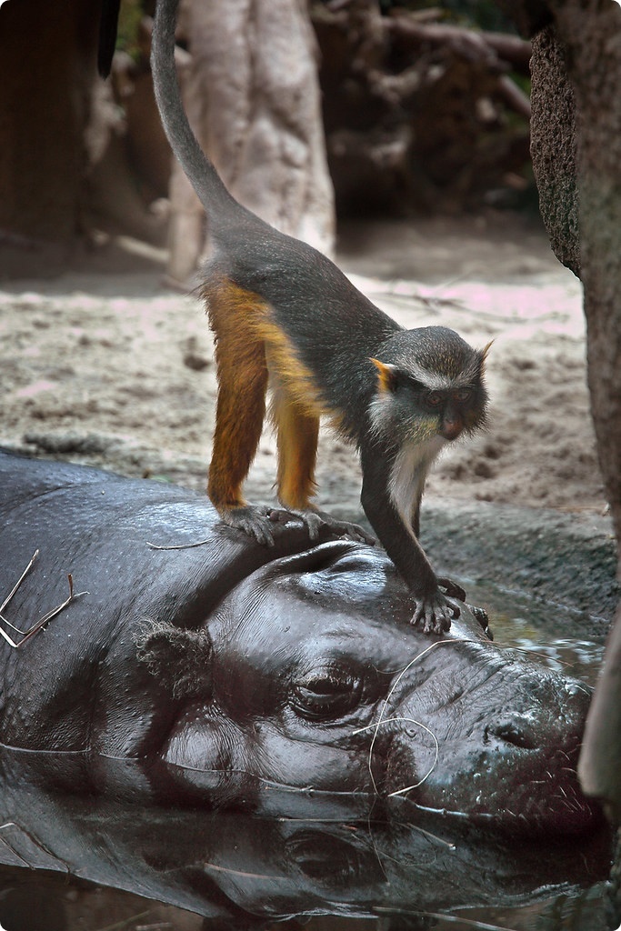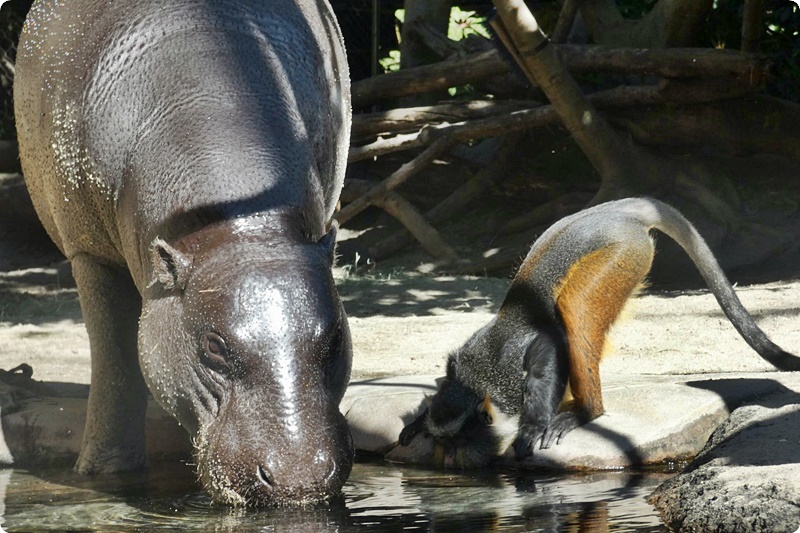 San Diego Zoo has established a very successful mixed exhibit with Pygmy Hippopotamus (1.1), Wolf's Monkey (2.1.1), Red-flanked Duiker (1.0) and Cape Blue Duiker (2.0) in 2005. The pair of hippos were the first into the exhibit; they were given access round to the bedrooms and exhibit. The duikers and the hippopotamuses were given access to both the exhibit and the bedrooms at night, while the monkeys were kept in the indoor holding at night. According to the introduction method the hippos were the first ones on exhibit. Once they were trained to re-call, the primates were introduced to the holding area. After a few days the monkeys were given access to the exhibit with the Pygmy Hippopotamuses in the barn. Once the monkeys were comfortable they were introduced to the hippos. The Duikers were introduced shortly thereafter with no special accommodations, except for some safety barriers – shade material fixed to the fence – to prevent injuries. The most notable interaction has been reported was that of the juvenile monkey and the Duikers, whom he has become accustomed to riding. This mixed exhibit was considered as a tremendous success for both the animals and the public, as it is one of the most unique and dynamic enclosures in the zoo. In 2012 the duikers were removed from the exhibit; they were managing well, but not thriving due to young Wolf’s Monkeys jumping on their back (STRANGE HONEYCUTT 2013). This interaction can also be frequently observed in reference to the Pygmy Hippopotamuses: the Wolf’s Monkeys are jumping and travelling on the hippos’ back.