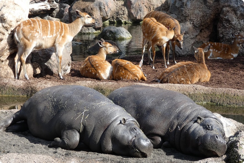 San Diego Zoo Safari Park has previously exhibited Pygmy Hippopotamus together with Grant’s Zebra, Grevy’s Zebra, Northern White Rhinoceros, Eastern Black Rhinoceros, East African Sitatunga, East African Eland, Topi, Defassa Waterbuck, Uganda Kob, Red Lechwe, Nile Lechwe, Common Impala, Thomson's Gazelle, Slender-horned Gazelle, Grant's Gazelle, Fringe-eared Oryx, Angolan Roan Antelope, Eastern White-Bearded Wildebeest, Cape Buffalo and Rothschild's Giraffe in a 36 hectare East Africa Exhibit. Over the years the institution has exhibited many of those species together at one time or another and never had any trouble with the hippos, but to tell the truth they mostly stayed on an island in the middle of the pond that was in the exhibit (BLUE 2008, pers. comm.).