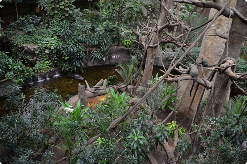 The length of time the above-mentioned mixed-species group has been together in Brookfield Zoo: there has been a consistent core group of species – Sooty Mangabey, Mandrill and Guereza – since 1982. The current Sooty Mangabey and Mandrill groups still include some of the original individuals from the 1982 opening of the exhibit. The Sykes’s Monkeys were a consistent part of the exhibit mix for 13 years, from 1982 to 1995. Talapoin Monkeys and Red-tailed Monkeys were also part of the original mixed exhibit, but were removed in 1985. The Red-tailed Monkeys and the Sykes’s Monkeys were not exhibited together due to the potential of hybridization. The original Pygmy Hippopotamus died in 1991 and was replaced. The number and variety of birds has varied since 1982. The method of introduction was to introduce the “smaller more benign” species first – i.e. Talapoin Monkey and Red-tailed Monkey – and work up through the “larger, potentially more aggressive” species – i.e. Sykes’s Monkey, Sooty Mangabey, Mandrill and Guereza. Almost each species had a few days on exhibit alone before any polyspecifics were added to the introduction. In reference to occurrence of birth all primates were regularly bred in the exhibit. Worth mentioning that all primate and bird interactions were negative; it has been reported that some of the birds were eaten or killey by Sooty Mangabeys and Mandrills. In general, the animals are separated at night by species, using different access doors (STRANGE HONEYCUTT 2013).