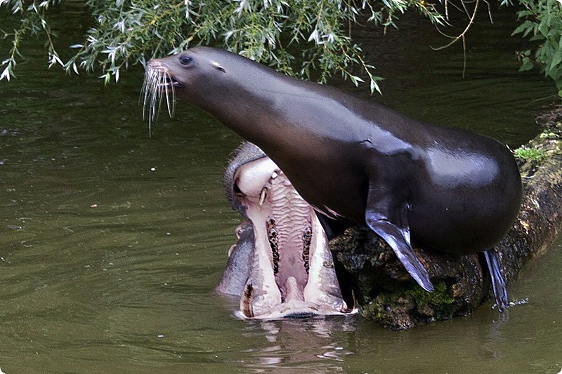 Certain zoos keep Pygmy Hippopotamuses with several fish species – i.e. with Labeo spp. or West African Cichlids. The fish feed on the faeces but do not succeed in clearing the water from debris. Furthermore fish can feed on the skin and wounds of the hippos. The disadvantage of this is that the fish will keep wounds open for longer so careful monitoring is needed (HOUWALD et al. 2020).