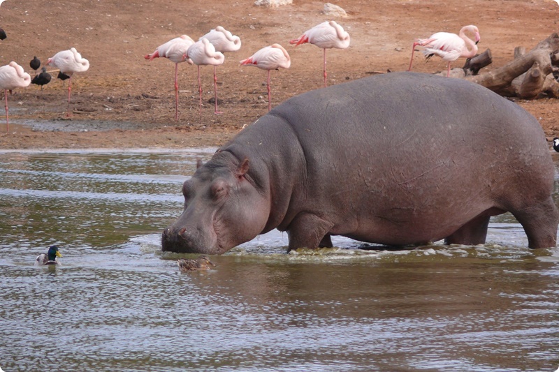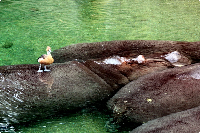 The Common Sandpiper has often been reported on the backs of hippos (RICE 1963, THOMSON 1964) foraging from there for aquatic organisms. POOLEY (1967) gives further records of birds fishing off hippos, although CURRY-LINDAHL (1961) records 28 species of birds associating with Hippopotamuses (OLIVIER & LAURIE 1974). It is also worth mentioning that Hippopotamuses have commensally beneficial associations with birds and often they will use the backs of hippos as fishing sites. In nature species of stork, spoonbill, egret and heron – i.e. Goliath Heron (Ardea goliath) – have been observed on a regular basis – and further species such as Little Grebe (Tachybaptus ruficollis), Whistling-duck (Dendrocygna sp.), Egyptian Goose (Alopochen aegyptiaca) and Spur-winged Goose (Plectropterus gambensis) on a less regular basis – looking for plant material that Hippopotamuses displace (ELTRINGHAM 1999).