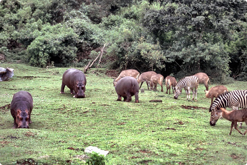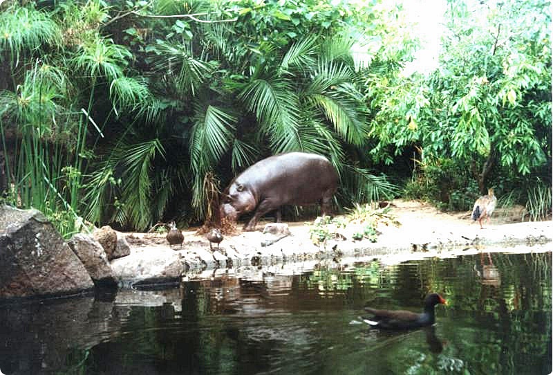Hippopotamuses can be very dangerous animals so in former times it was thought that they cannot be combined with other species in captivity (PUSCHMANN 1983). The other basic reason to have not associated them with other taxa was keeping them mostly in small indoors where no space was available for other species. Later on this has changed and huge outdoor enclosures and aviaries as well made it possible to combine them principally with primates and ungulates, but with many species of birds and fish as well. Just as a point of interest GRZIMEK (2000) reported a friendship of an adult female Hippopotamus – which was kept alone in Zoologischer Garten Halle – with a dog which was allowed to crawl into the hippo’s mouth and licked there. Worth mentioning that especially young and playful hippos turn to other species in the absence of playmates and they particularly profit from cohabitations established in mixed exhibits (HAMMER 2002).