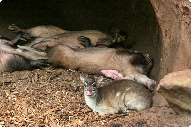 In the Bronx Zoo Aardvarks (1.0 or 0.1), Maxwell’s Duikers (1.1 or 1.0) and Northern White-faced Owls (1.1.2 or 1.1) have been successfully mixed since 2012. This nocturnal exhibit was specifically built for Aardvark. The zoo has not bred the duikers since mixing them with Aardvarks and have never had more than one Aardvark in this mixed-species exhibit. It took a plenty of time to get the duikers acclimated to this enclosure (AZA Ungulate TAGs 2017).