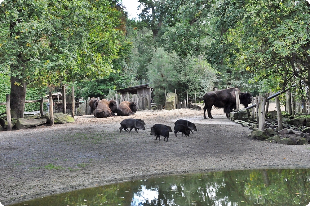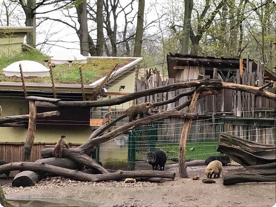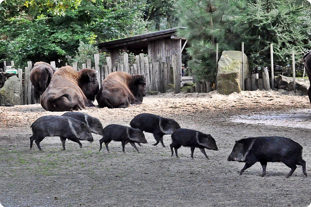 In Tierpark Nordhorn the Collared Peccary and Wood Bison mixed exhibit opened in 2012. Inside the stables the peccaries have about 14 m² available and the bison’s 80 m². The separation enclosures measured 92 m² and 33 m² in size. The mixed-species exhibit is approximately 1600 m², thereof 100 m² are retreat areas for the peccaries. On the opposite side of the main exhibit there is an additional space for the smaller species with a shelter. Wooden poles and electric fencing prevent the bison from entering this area. Keeping bison and peccaries together seems to be enriching for both species. Sometimes playful chasing behaviors have been observed between young bison and peccaries (HOMBURG, ZooLex 2019). The White-nosed Coatis are meant to have access to the peccary and bison mixed exhibit. A tunnel with slides to connect both areas was built under the visitor path. This cohabitation so far was not tested because it requires additional fencing in the mixed exhibit (HOMBURG, ZooLex 2020).