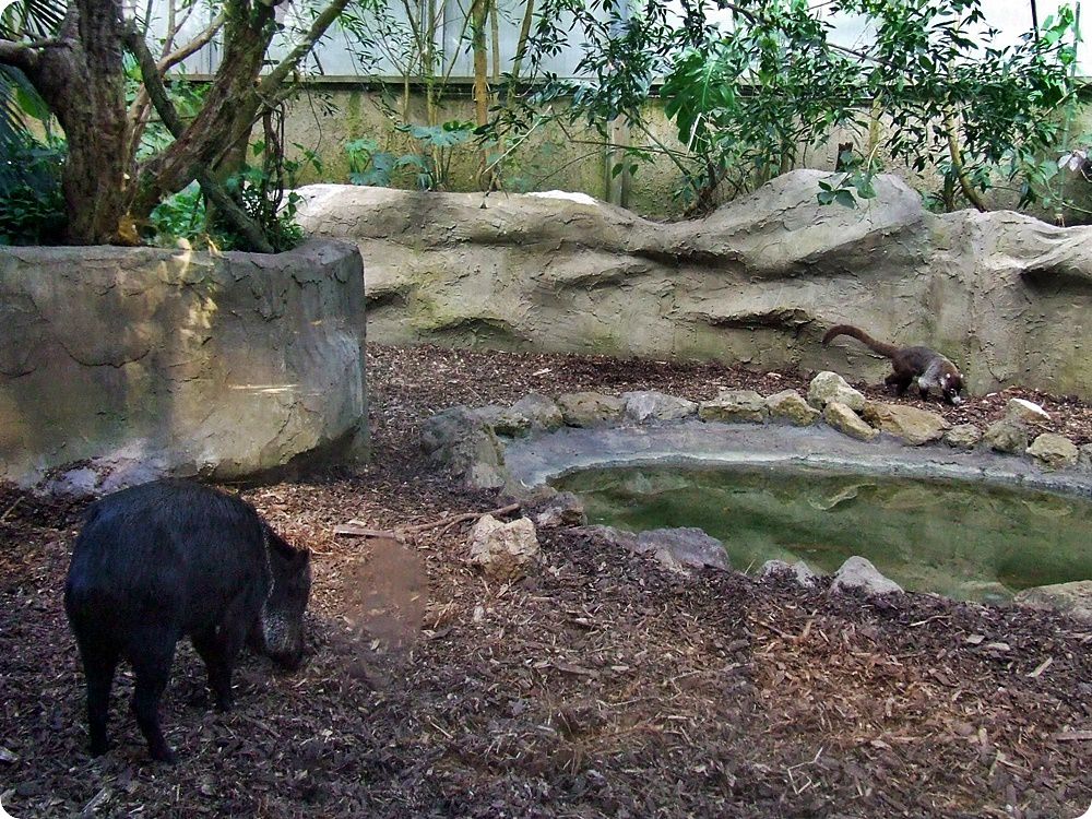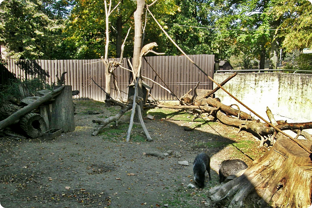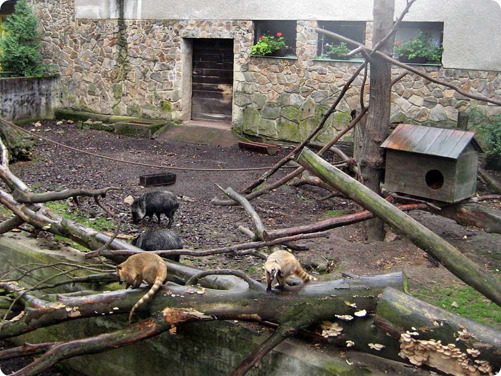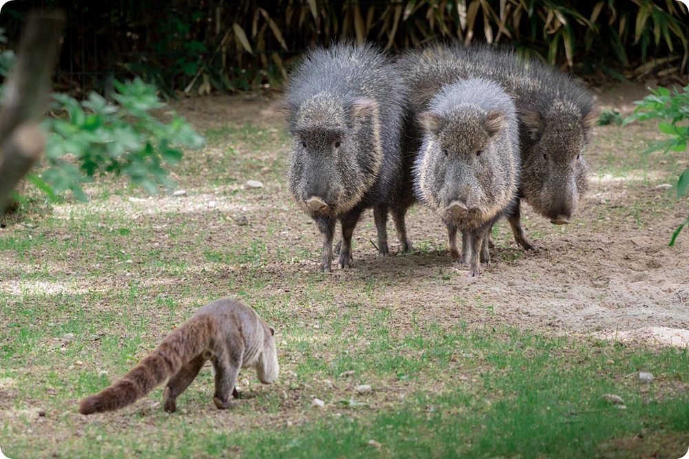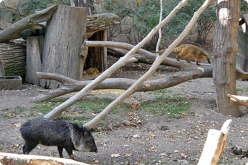 One of the most frequent associations is the Collared Peccary & South American Coati coexistence which has been tried in many institutions. In Zoo Salzburg Hellbrunn the coatis had their own enclosure but had access to the peccaries (HAMMER 2002).