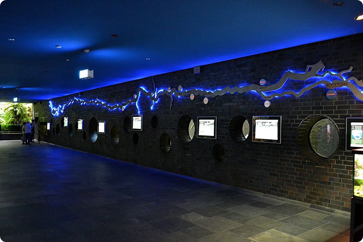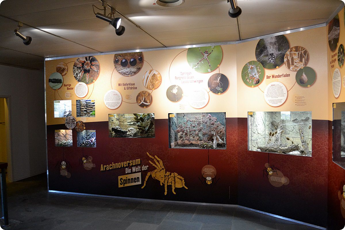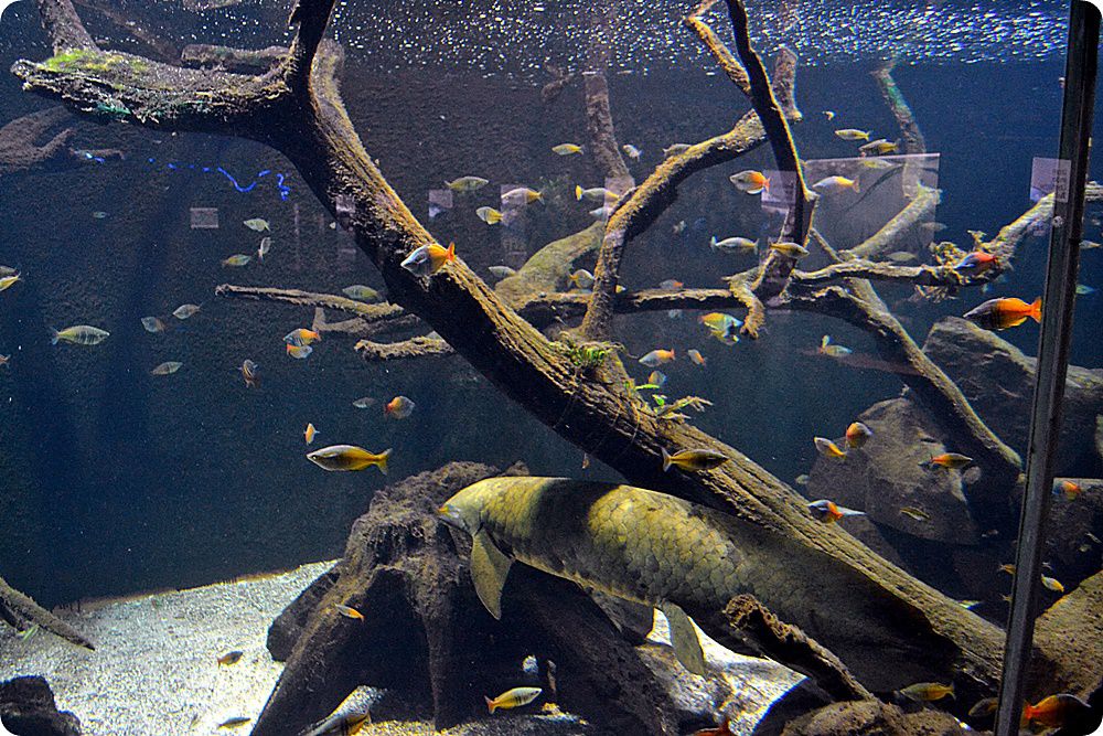 A fenti felvételen az akvárium-részleg főcsarnoka látható. Bár a bemutató e részén kisebb trópusi tengeri és hidegvízi édesvízi akváriumok is helyet kaptak, a legnagyobb medence a közeli Rajna folyó halfaunájából kínál ízelítőt. Az akvárium végighúzódik a látogatói útvonal mentén, a vendégek kisebb ablakokon keresztül tekinthetik meg az itt otthonra lelt halakat, miközben képzeletben végigsétálhatnak a folyó teljes szakaszán a bemutató felett kialakított térkép segítségével. A felvétel bal oldalán, a háttérben a vöröshasú pirájákat (Pygocentrus nattereri) és más, Dél-Amerikában őshonos halfajokat bemutató akvárium egy részlete látható.