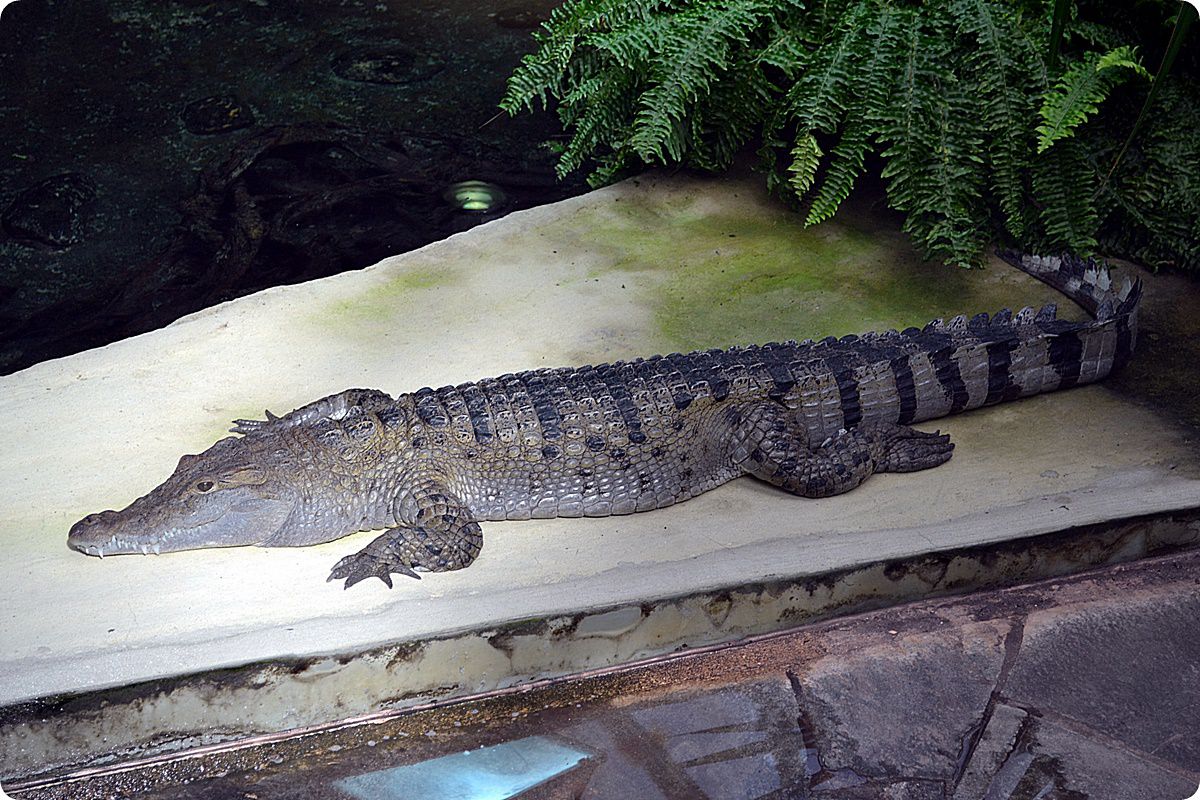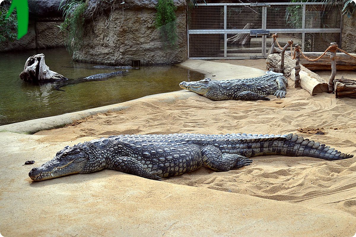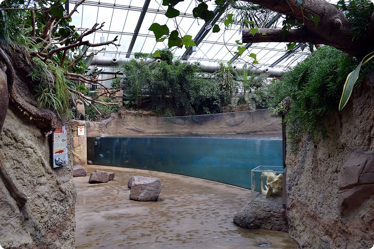 A látogatók körében igen nagy népszerűségnek örvendenek a vízilovak és a krokodilok víz alatti mozgásának megtekintését lehetővé tevő, óriási betekintő ablakok, melyek előtt a két faj koponyái is helyet kaptak. A felvétel bal oldalán egy kihalt, nagyméretű krokodilfaj, a Deinosuchus csontváza látható.