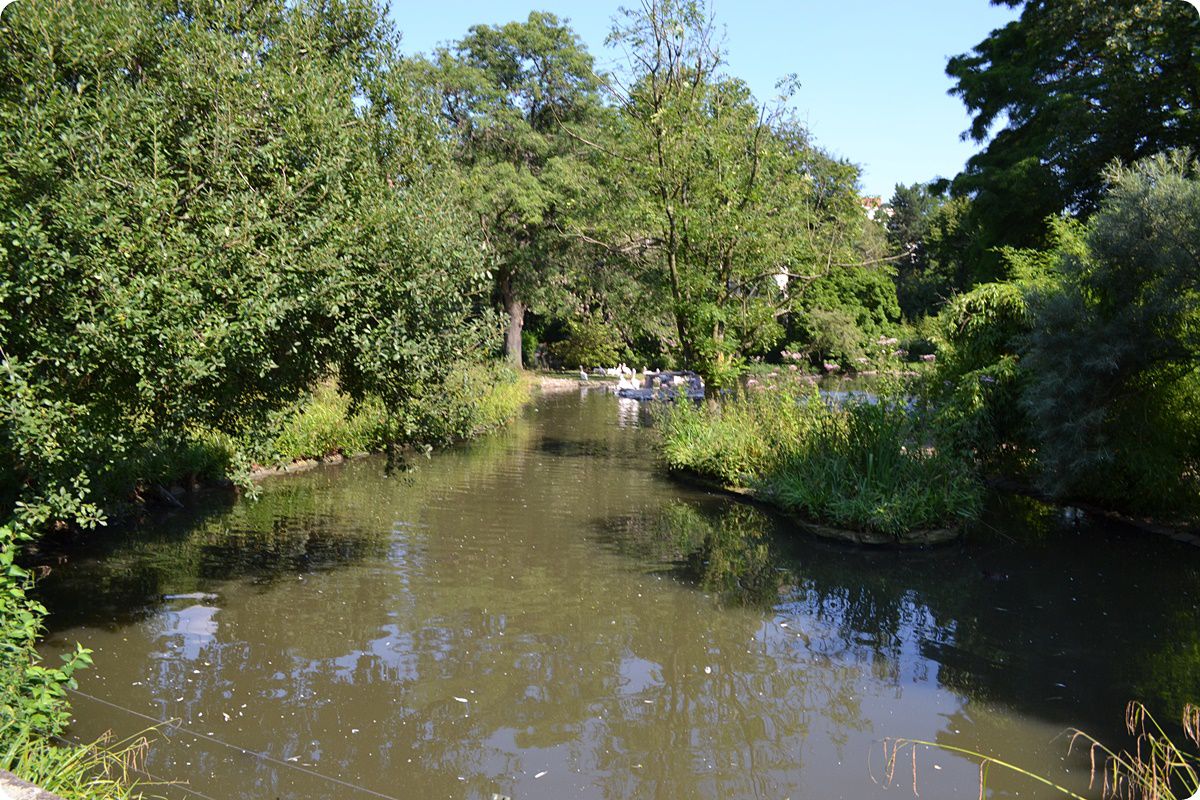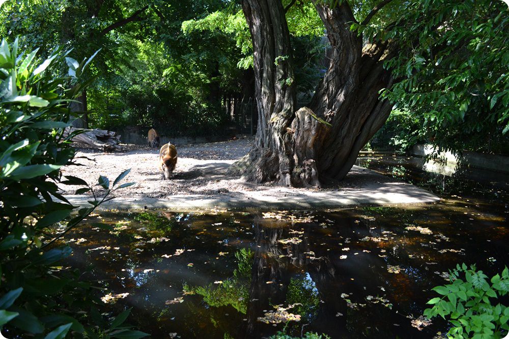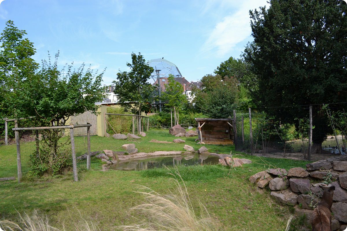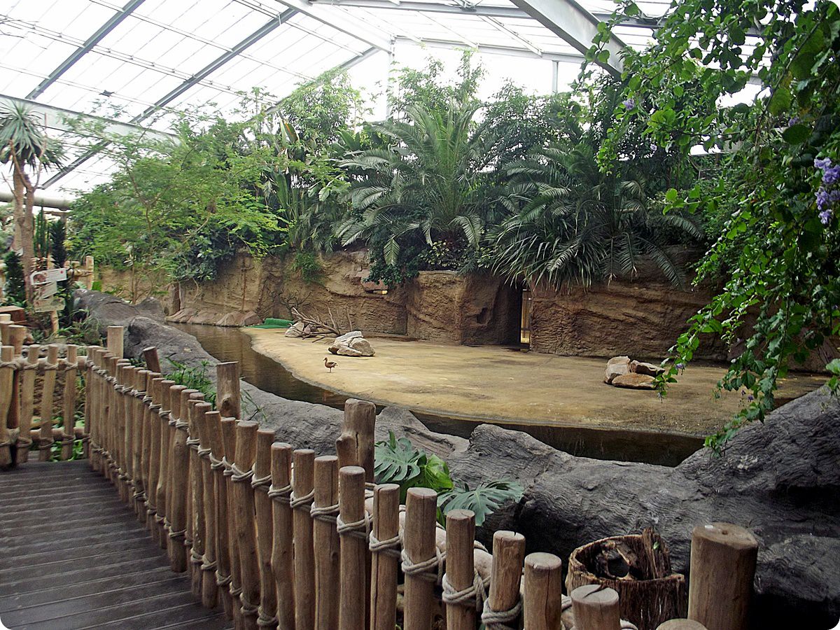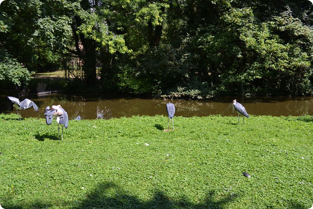 A Kölni Állatkert területén egy kis folyó halad keresztül, melynek vizét több helyen felduzzasztották, ideális élőhelyet teremtve ezzel a vízimadarak számára. A képen az afrikai marabuk (Leptoptilos crumenifer) és a kaffer szarvasvarjak (Bucorvus leadbeateri) közös férőhelye látható.