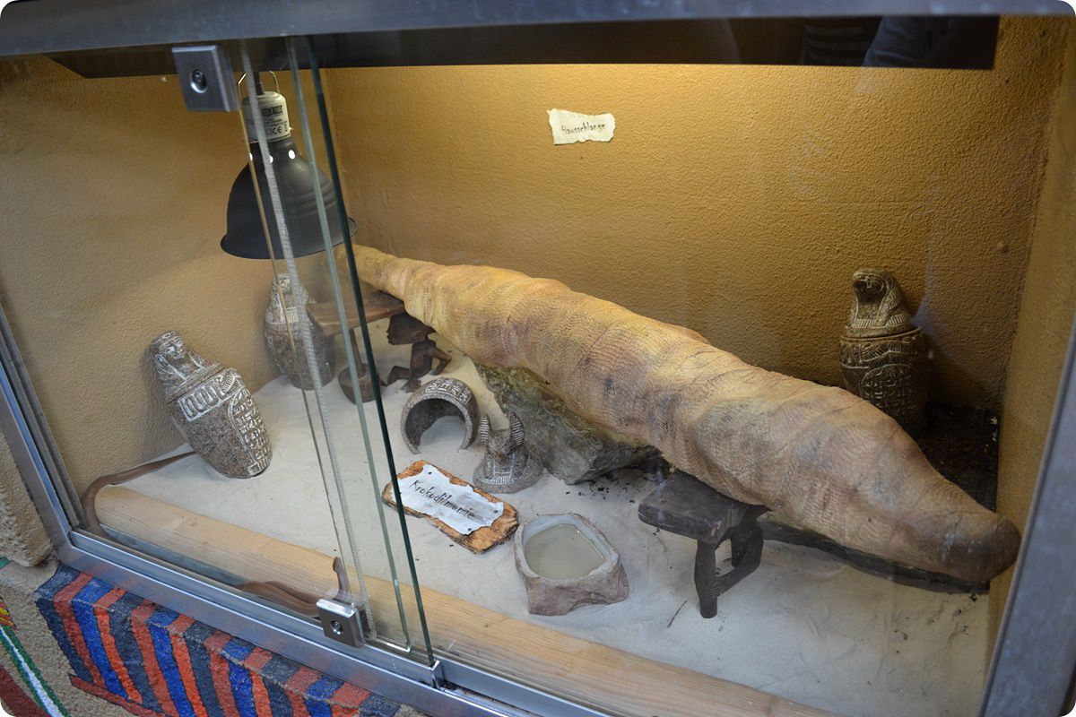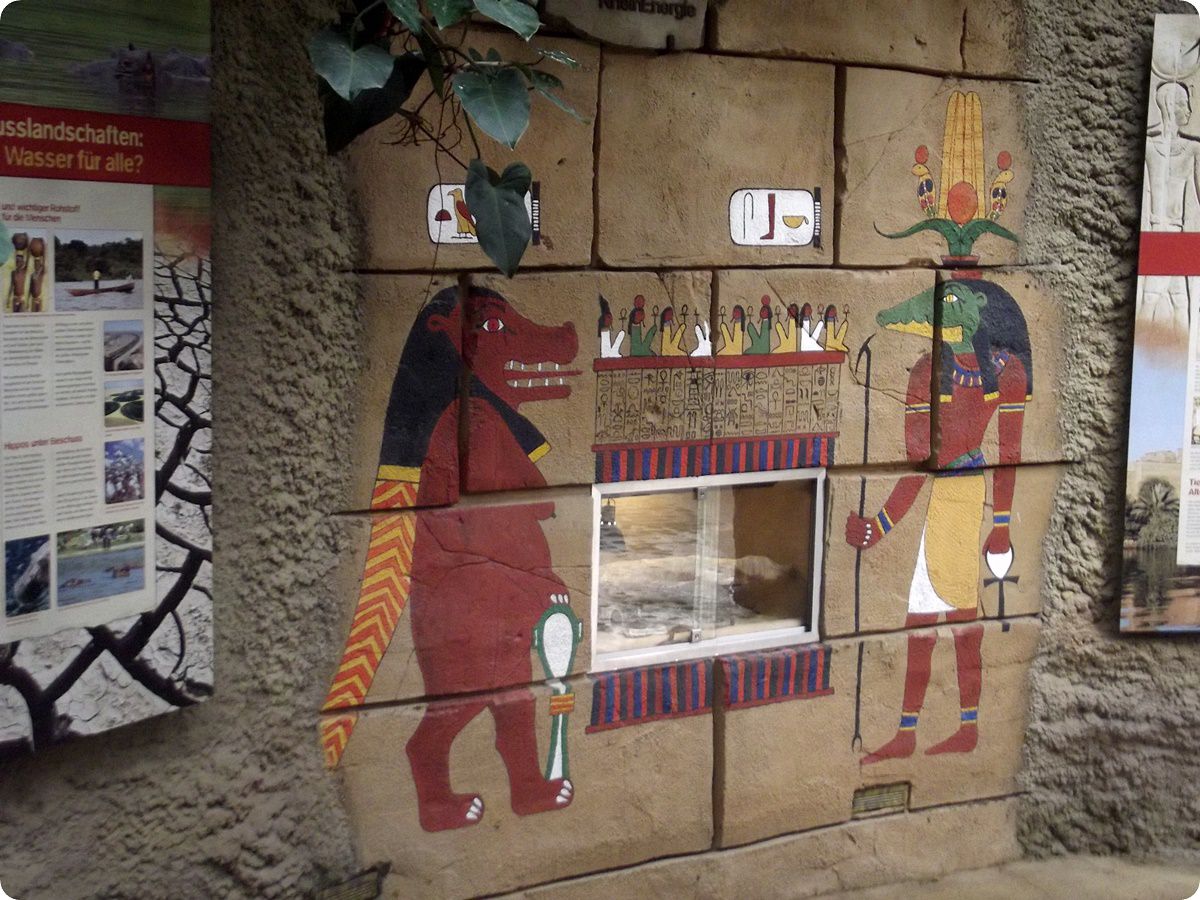 A Hippodom nem csupán állatbemutatóként funkcionál, etnográfiai tárgyak széles garmadáját is felvonultatja a nagyközönség előtt. A krokodilbemutatóban egy komplett egyiptomi csónak megtalálható, felszereléssel együtt, de az épületben itt-ott más helyszíneken is feltűnnek a jellegzetes maszkok, hidak, falfestmények, vagy éppen ládák, melyek egyikében afrikai ökörbékák (Pyxicephalus adspersus) férőhelye került kialakításra. A képeken az afrikai házisiklók (Boaedon fuliginosus) terráriuma látható, melyet egyiptomi hieroglifák díszítenek. A terráriumban több, a múmiák balzsamozásához egykor elengedhetetlen eszköz mellett egy krokodilmúmia másolata is helyet kapott.