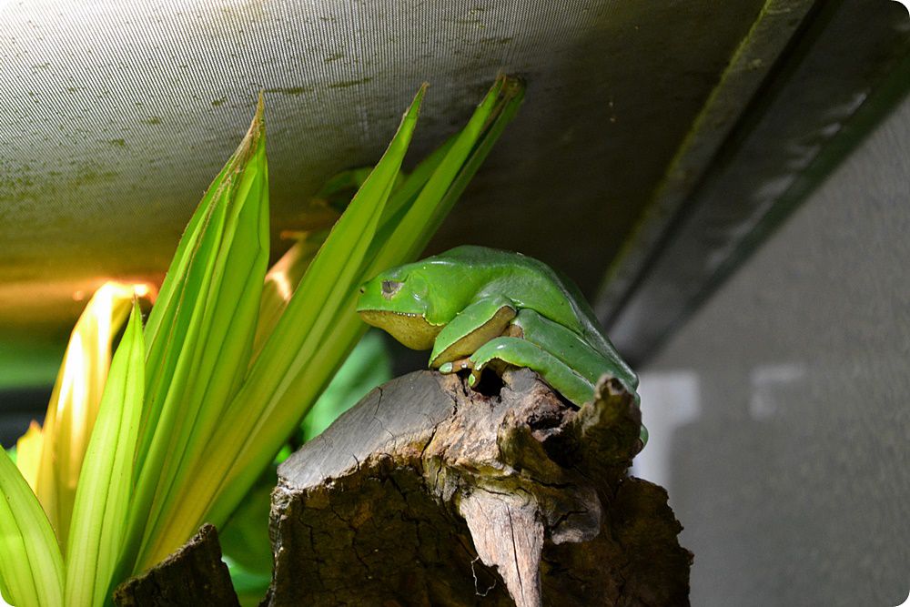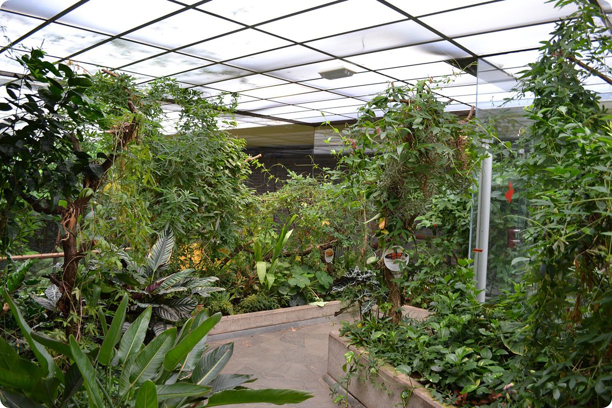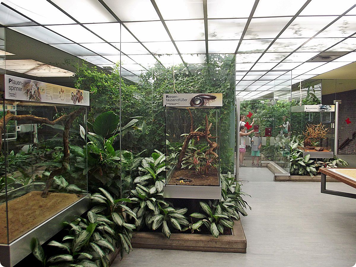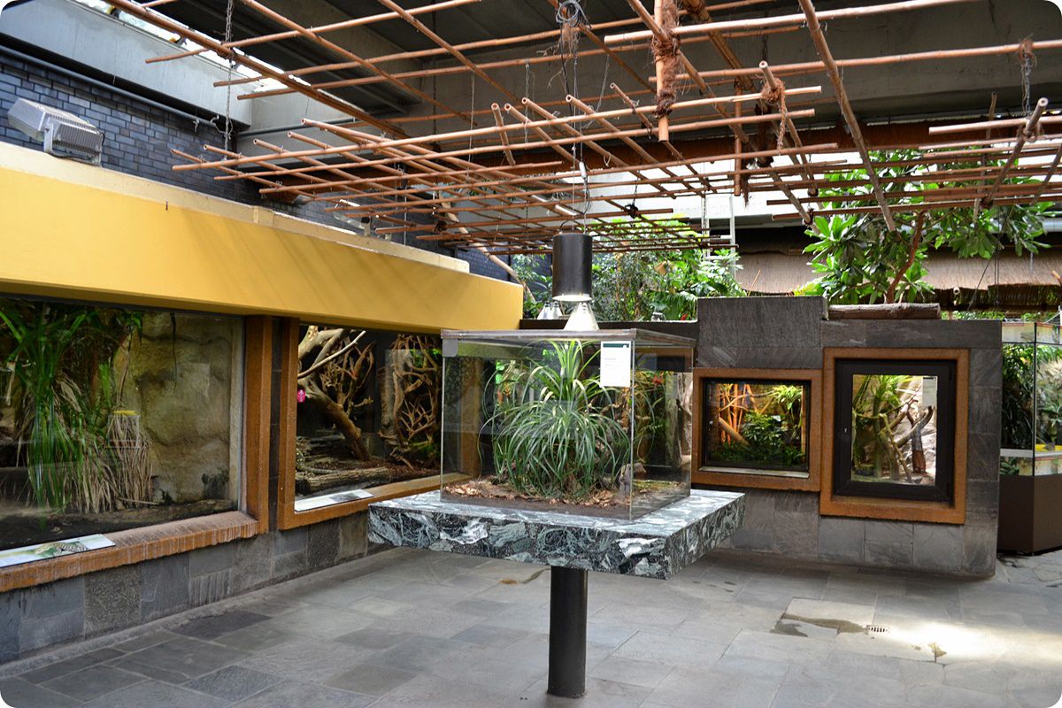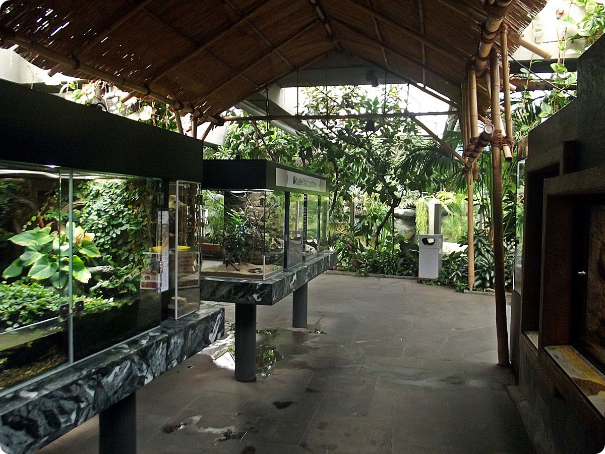 A lepkebemutatót több terrárium egészíti ki, egyebek mellett itt tekinthetjük meg az állatkert nyílméregbéka-gyűjteményének egy részét is. A felvételen a gyászbogarak (Blaps mortisaga), az óriás ezerlábúak (Archispirostreptus gigas), valamint az egyik legnagyobb lepkefaj, az imágó állapotban csupán néhány napig élő atlaszlepke (Attacus atlas) számára kialakított terráriumok láthatók.