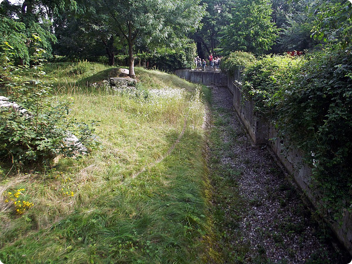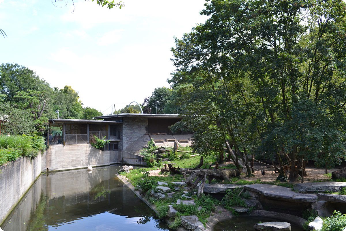 A tigriskifutót határoló, széles vizesárok kiváló úszási lehetőséget biztosít a nagymacskák számára. A felvételen jól látható az az épület, mely a nagymacskák és a méhészborzok (Mellivora capensis capensis) belső férőhelyeit rejti.