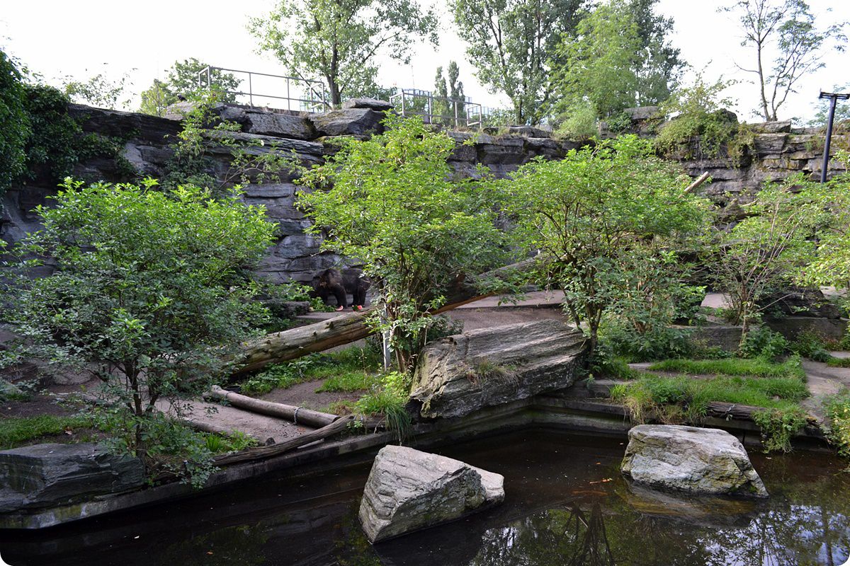 Mint az összes kölni medve-bemutatóra, a grizzlyk kifutójára is jellemző a viszonylag kicsi alapterület és a műsziklás háttér. A férőhelyek kis méretét különböző környezetgazdagítási eszközökkel igyekeznek kompenzálni: ezt a célt szolgálja a nagyméretű medence, a sok beültetett növény és a mászófák is. A kép jobb oldalán jól látható az az etetőoszlop, ahonnan a medvéknek saját maguknak kell leszedniük vagy lerázniuk táplálékuk egy részét, de a grizzlyk számára két, nagyméretű kefe felhasználásával vakaródzó oszlop is készült.