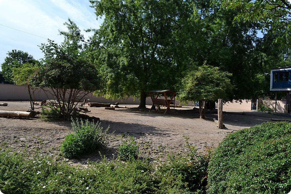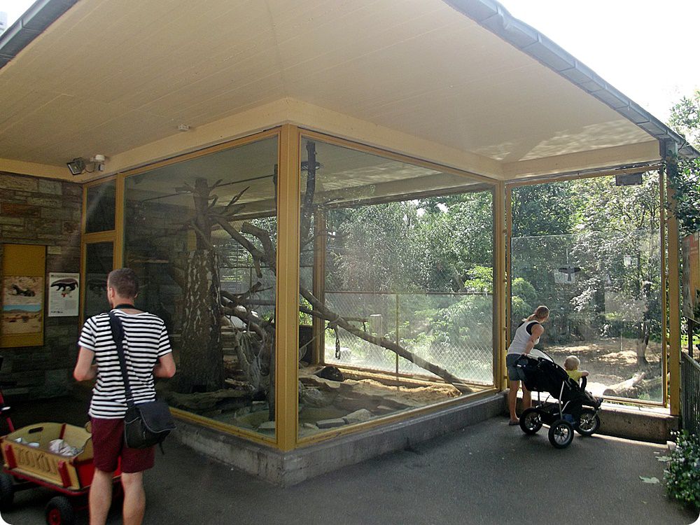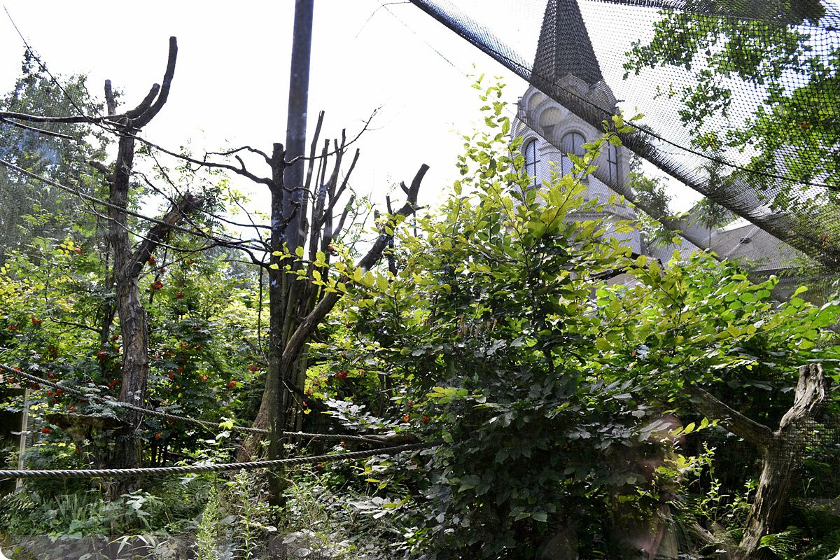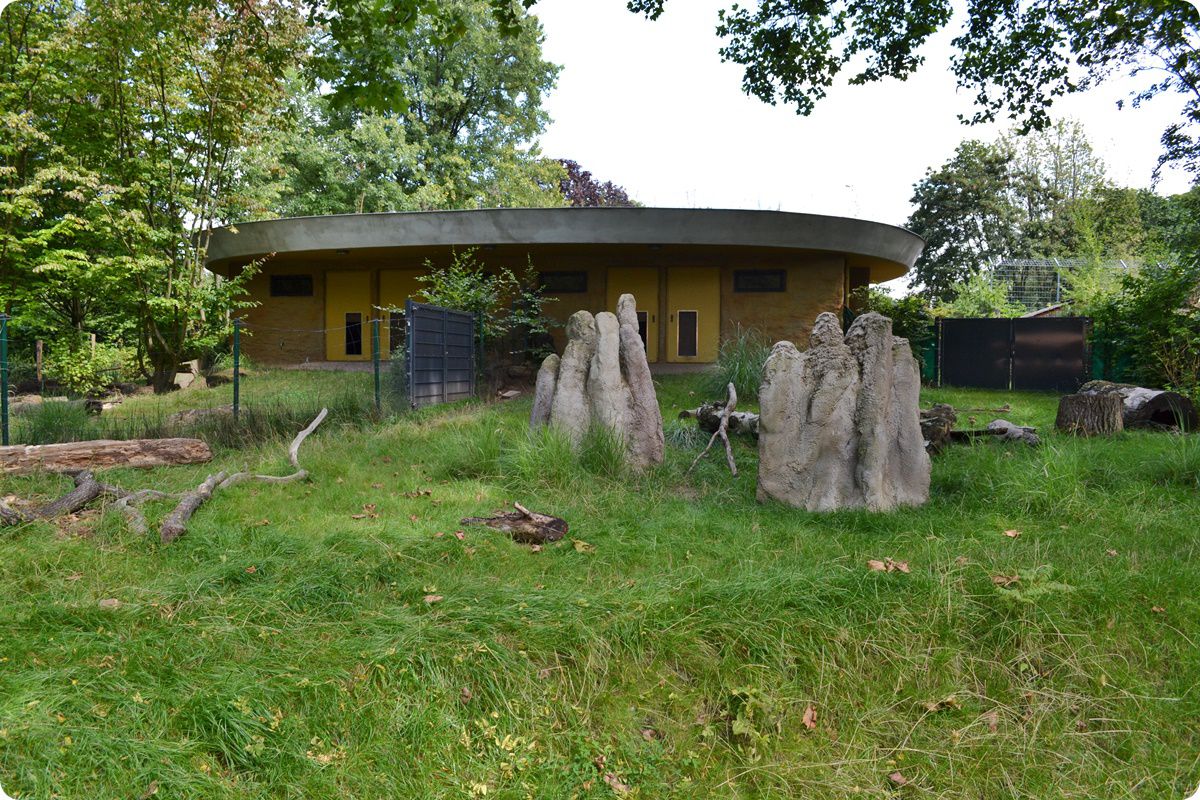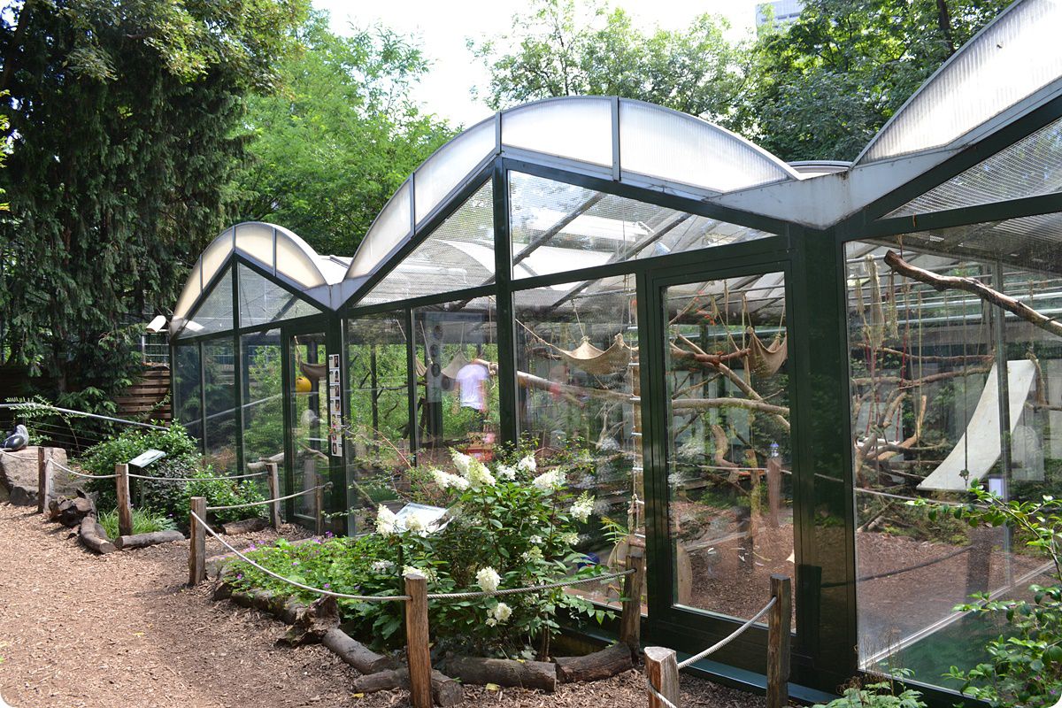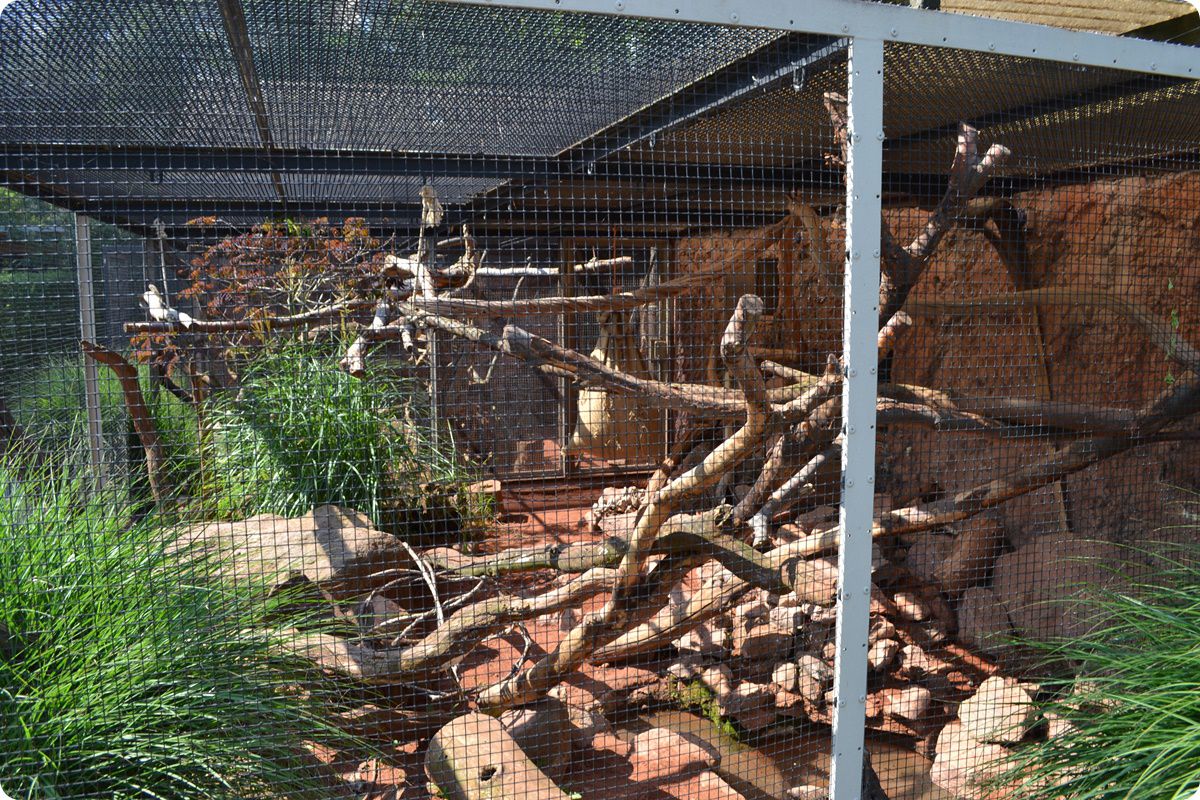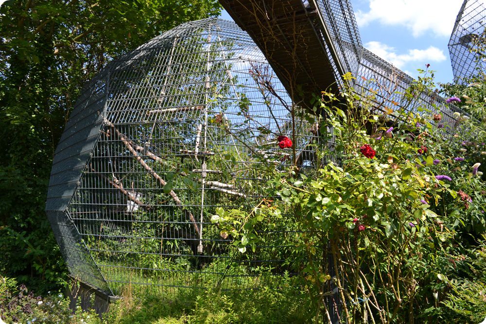 Külső férőhelyeikről hosszú, rácsból készült átjáró folyosókon járhatnak ki az állatok a képen látható, nagyméretű, gömb alakú ketrecekbe, melyek távolról sem nevezhetőek esztétikusnak.