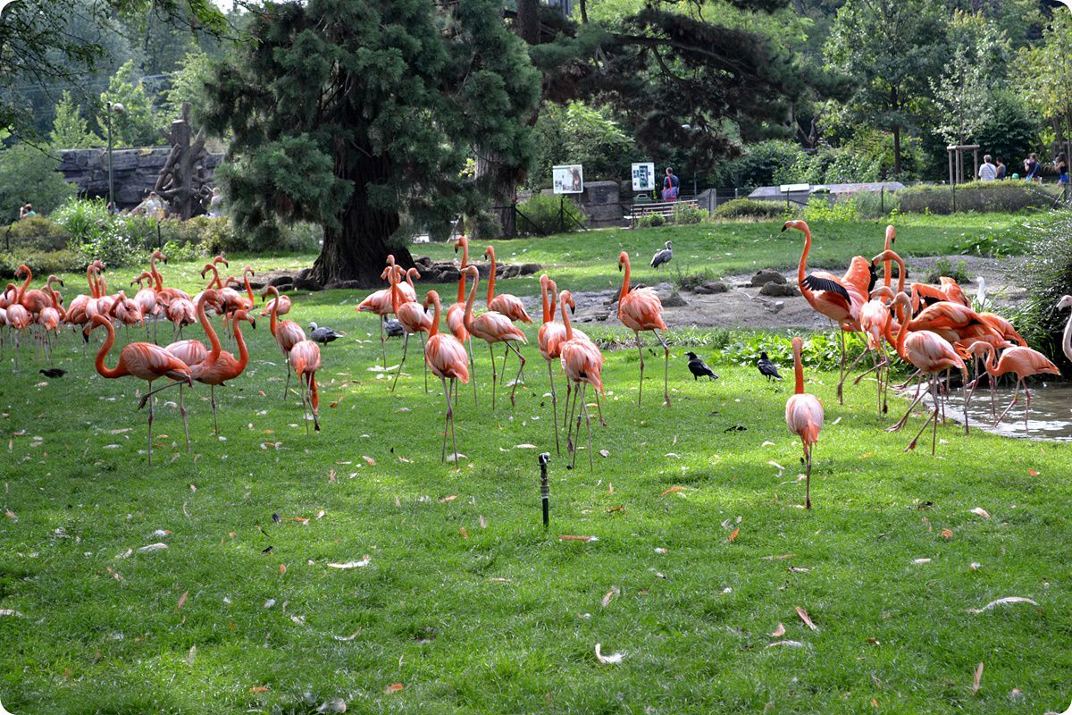 Kubai vörös flamingók (Phoenicopterus ruber) népes csapata. A felvételen két faj is látható a flamingókkal közös kifutóban élő madarak közül, a császárlúd (Anser canagicus) és az örvös csája (Chauna torquata), e mellett a képen az állatkert területén szabadon élő vízityúkok (Gallinula chloropus) és az igen nagy számban jelen lévő kormos varjak (Corvus corone) is megfigyelhetőek.