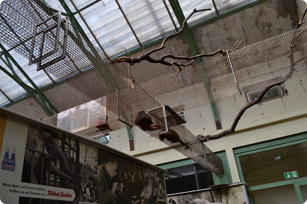 A Dél-Amerika Ház majombelsőinek részlete. A felvételen látható az a speciális átjáró, melyen keresztül a karmosmajmok közelíthetik meg a számukra fenntartott belsőket, ha szeretnének elvonulni a két, nagyobb testű faj elől.