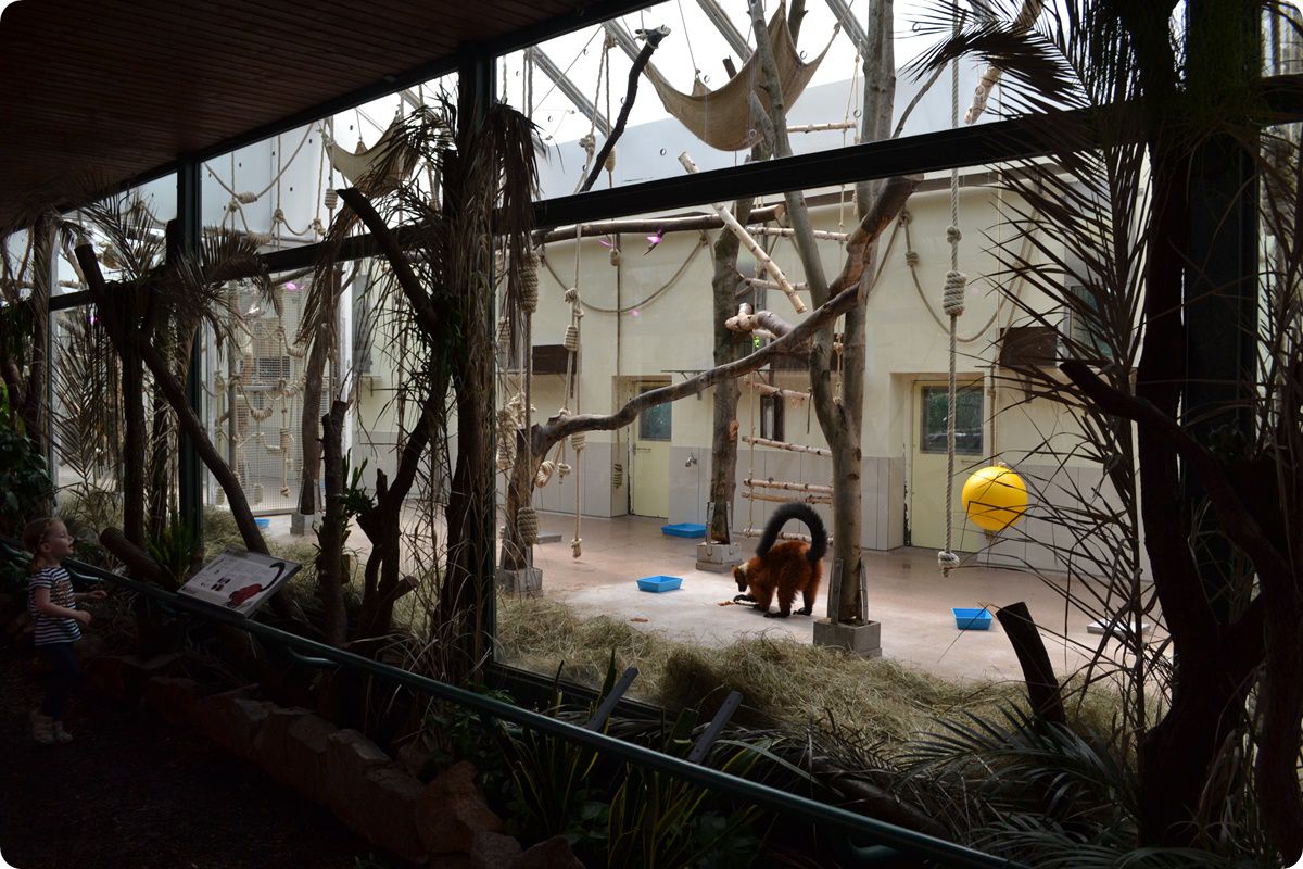 A Madagaszkár-ház belső férőhelyei. A külső ketrecekhez hasonlóan itt is üvegen át tekintheti meg a közönség a makikat, melyek előtt az állatok nyugalma érdekében biztonsági korlát is húzódik.