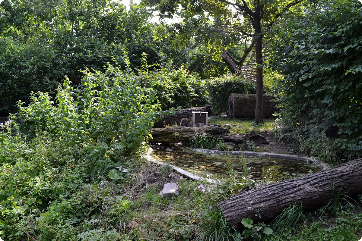Akárcsak a medvéknél vagy a kis pandáknál, úgy a mosómedvék esetében is számos környezetgazdagítási eszköz áll az állatok rendelkezésére. Az állatok számára medence is épült, e mellett odvas farönkökben bújhatnak el a kíváncsi szemek elől, vagy ha éppen kedvük tartja, élő fák koronájára mászhatnak fel. A naponta kétszer megtartott látványetetések során az állatok élelmük egy részét a képen látható etetődobozból szedik ki, ezzel is elősegítve a természetes viselkedési formák kialakítását.