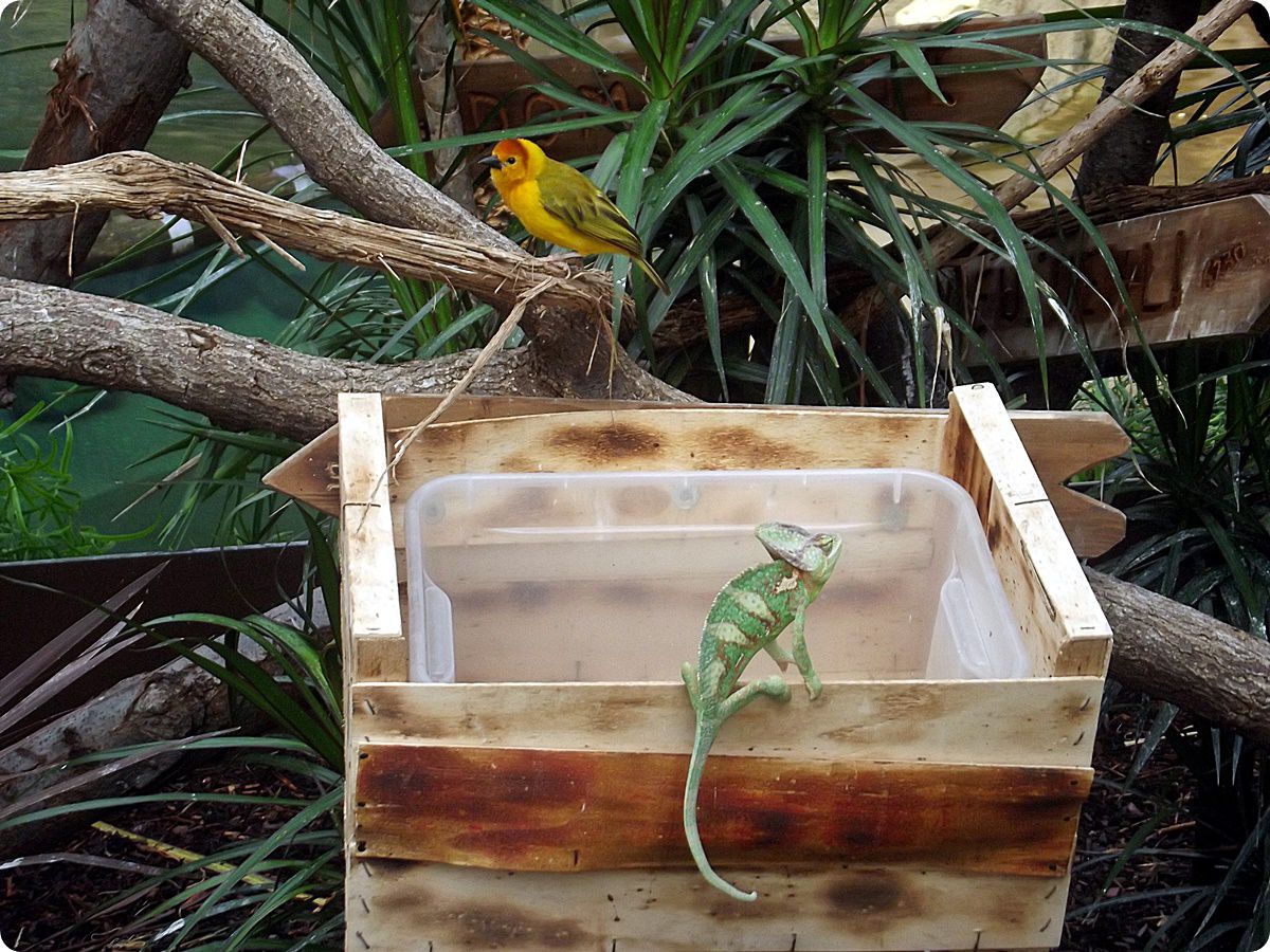 A sisakos kaméleonok (Chamaeleo calyptratus) terráriumában rendhagyó díszletként egy vízilókoponya is helyet kapott. A csarnokban szabadon röpködő madarak némelyike időnként leszáll a kaméleonok közé, elcsenni egy ízletesebb lisztkukacot a hüllők orra elől. A képen egy szövőmadár, a barnás aranyszövő (Ploceus castaneiceps) látható.