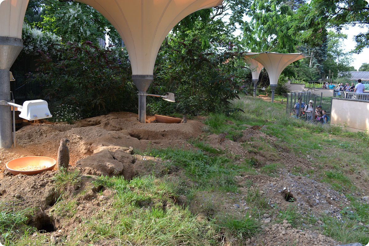 A hatalmas, 500 m2-es szurikátakifutó legmeghökkentőbb berendezési tárgyai az óriási művirágok, melyek voltaképpen az állatok kényelmét szolgáló, napelemes melegedőlámpák.