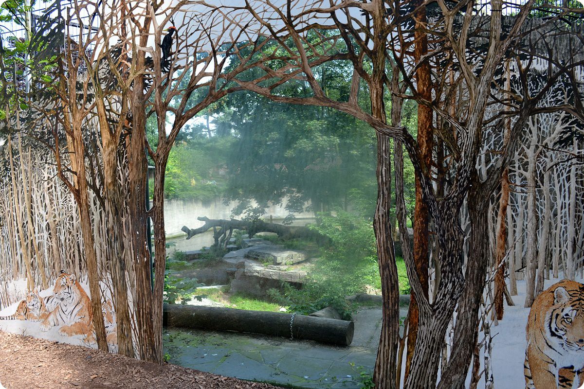 A szibériai tigrisek kifutójára néző üveg betekintő ablak körül különböző állat- és növénymotívumokat fedezhetünk fel.