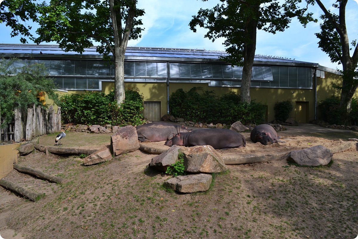 A vízilovak 220m2-es belső férőhelyüket és a hozzá tartozó 580 m³-es medencéjüket nílusi tilápiákkal (Oreochromis niloticus) és sujtásos fütyülőludakkal (Dendrocygna bicolor) osztják meg.