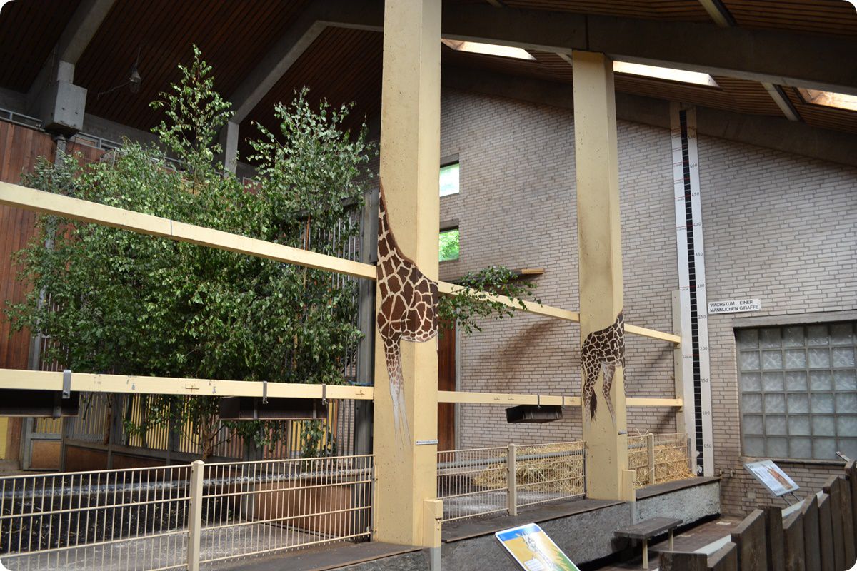 A Zsiráfház belső férőhelyei. Az épület oszlopaira a különböző zsiráf-alfajok mintázatát festették. A falon lévő skála segítségével - valamint, egy kis szerencsével - bárki lemérheti egy zsiráf magasságát.