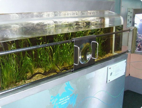 Balra: Egy jó és gyors úszású vízibogárcsalád, a csíkbogarak (Dytiscidae) egy faja, a Thermonectus marmoratus látható egy nagyméretű akváriumban. A medence előtt sínpályán húzható nagyítólencse segítségével követhetjük az állatok mozgását.