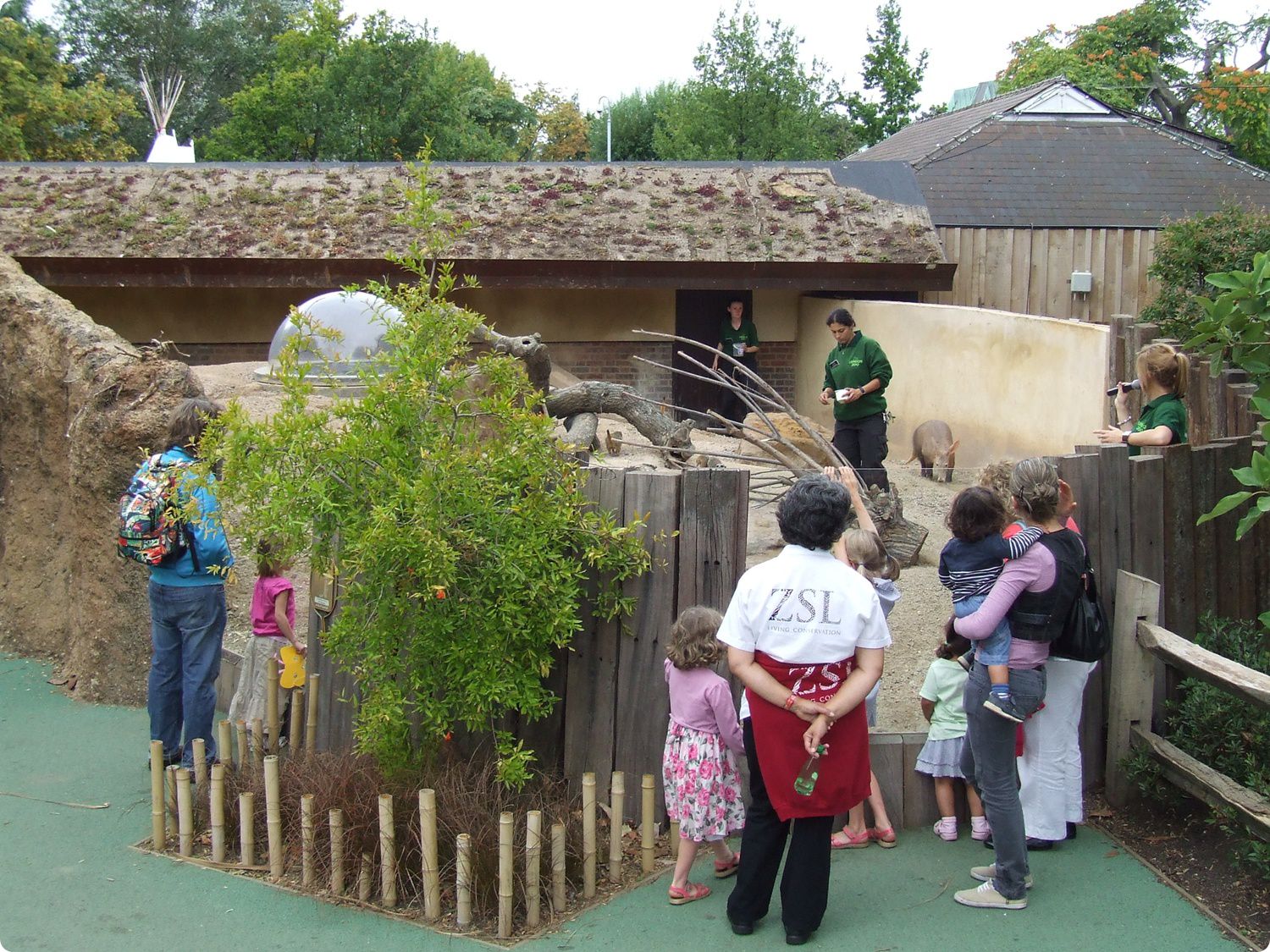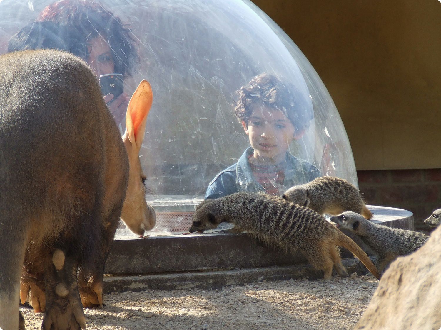 A gyermek-állatkert külön programskálával rendelkezik. A felvételen a földimalacok (Orycteropus afer) délutáni etetése látható, mely nagy népszerűségnek örvend a gyermekek körében. A földimalacok szurikátákkal (Suricata suricatta) osztoznak a külső kifutón és belső férőhelyen egyaránt, mely az ún. Gyökér Zónában (Root Zone) található.
