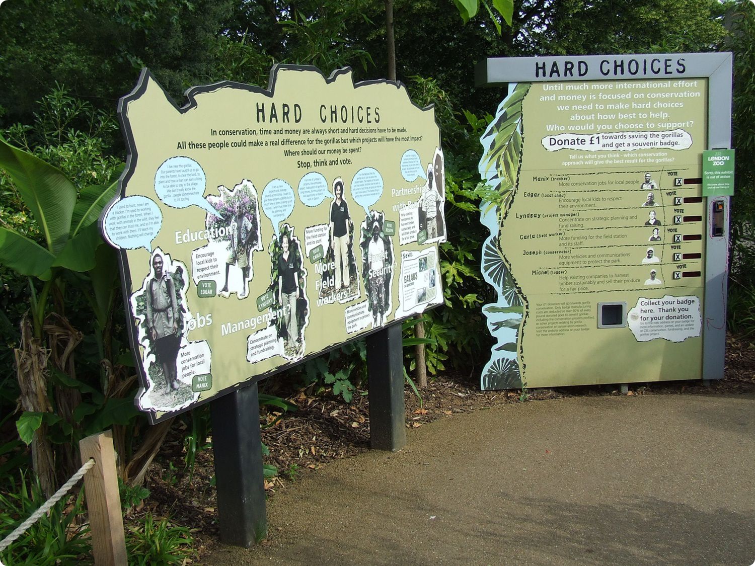 A kifutórendszer végén egy nagyméretű panel összegzi a kisfilmeken látottakat. Egy egyfontos érmével lehetőség van támogatni a kiválasztott részprogramot, melyért egy szuvenír kitűzőt kapnak cserébe a látogatók. Az adományokból befolyt összeg a megnyitást követő két és fél évben közel 50 ezer angol font volt.
