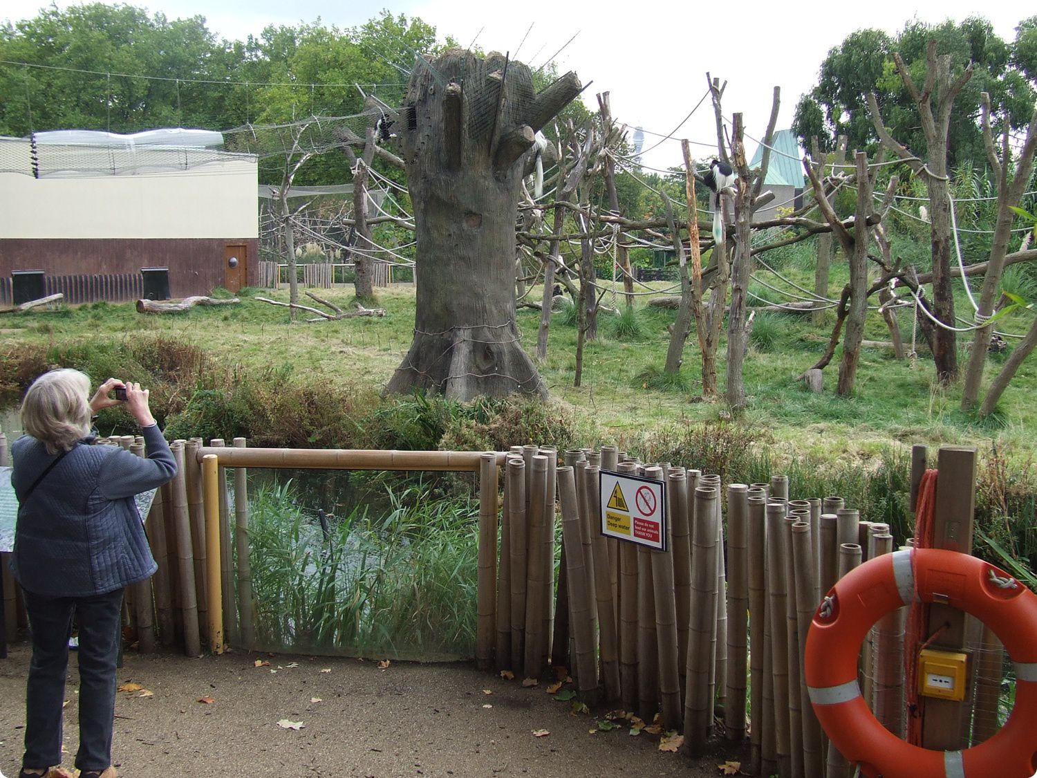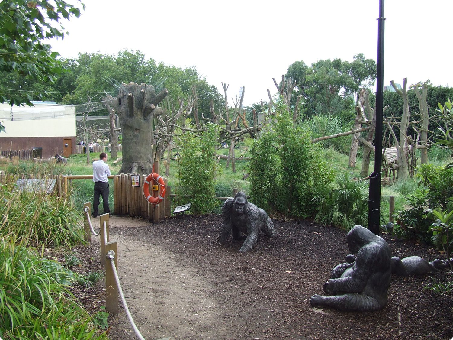 A látogatói útvonal mentén gorillaszobrokat (balra), valamint számos vetítőállomást (jobbra) helyeztek el. A videofelvételek folyamatosan futnak, így mellettük elhaladva jobban felhívják figyelmünket, mintha saját magunknak kellene gombnyomással indítani.
