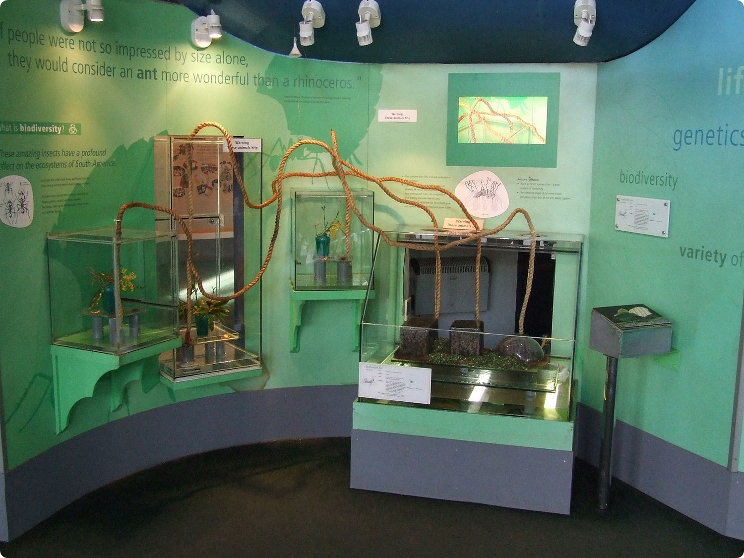 Egy levélvágó hangyafaj, az Atta cephalotes bemutatója. Egészen közelről, elválasztó felület nélkül csodálhatjuk meg a kolónia tagjait, amint faágakat imitáló köteleken levéldarabokat szállítanak a kialakított táplálkozóhelyeikről földalatti fészkükbe.