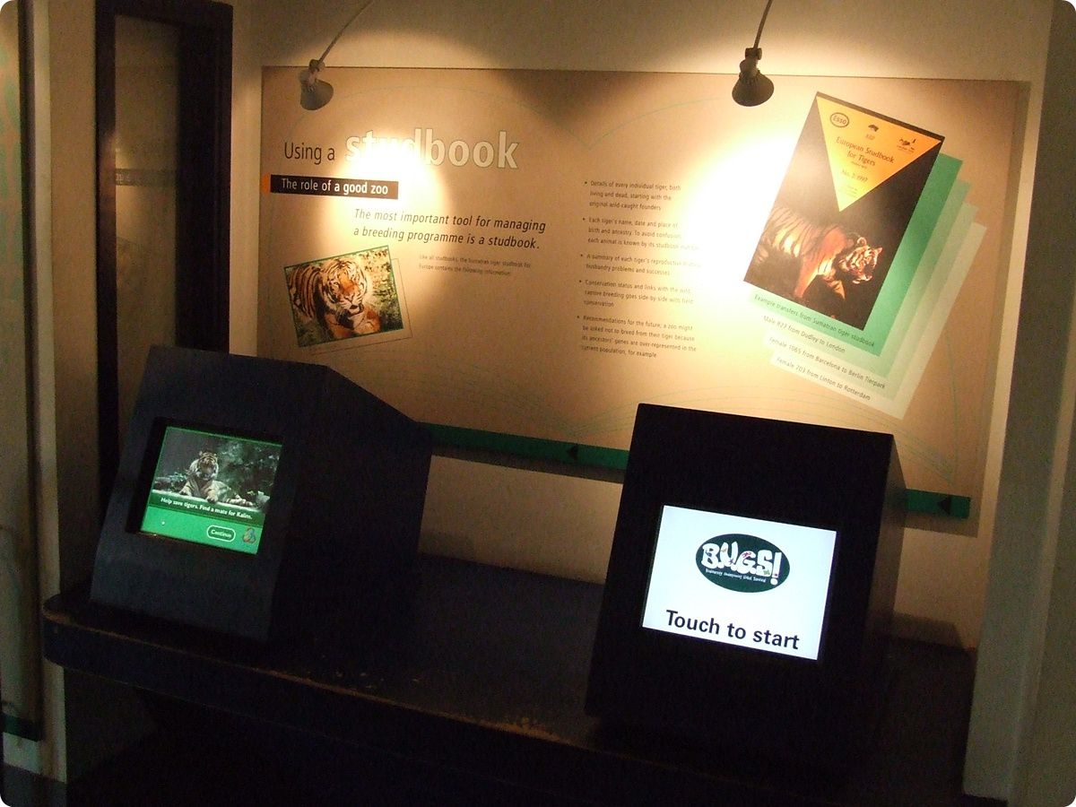 Jobbra: Mint korábban említettük, a tigrisek európai tenyészprogramját szintén a Londoni Állatkert koordinálja, melyhez kapcsolódóan a törzskönyvvezetés jelentőségével is megismerkedhetünk. Az érintőképernyős monitorok interaktív programjának segítségével a fajkoordinátor szerepébe helyezkedhetünk, mely során fény derül a megfelelő tenyészpárok összeállításának kulisszatitkaira.