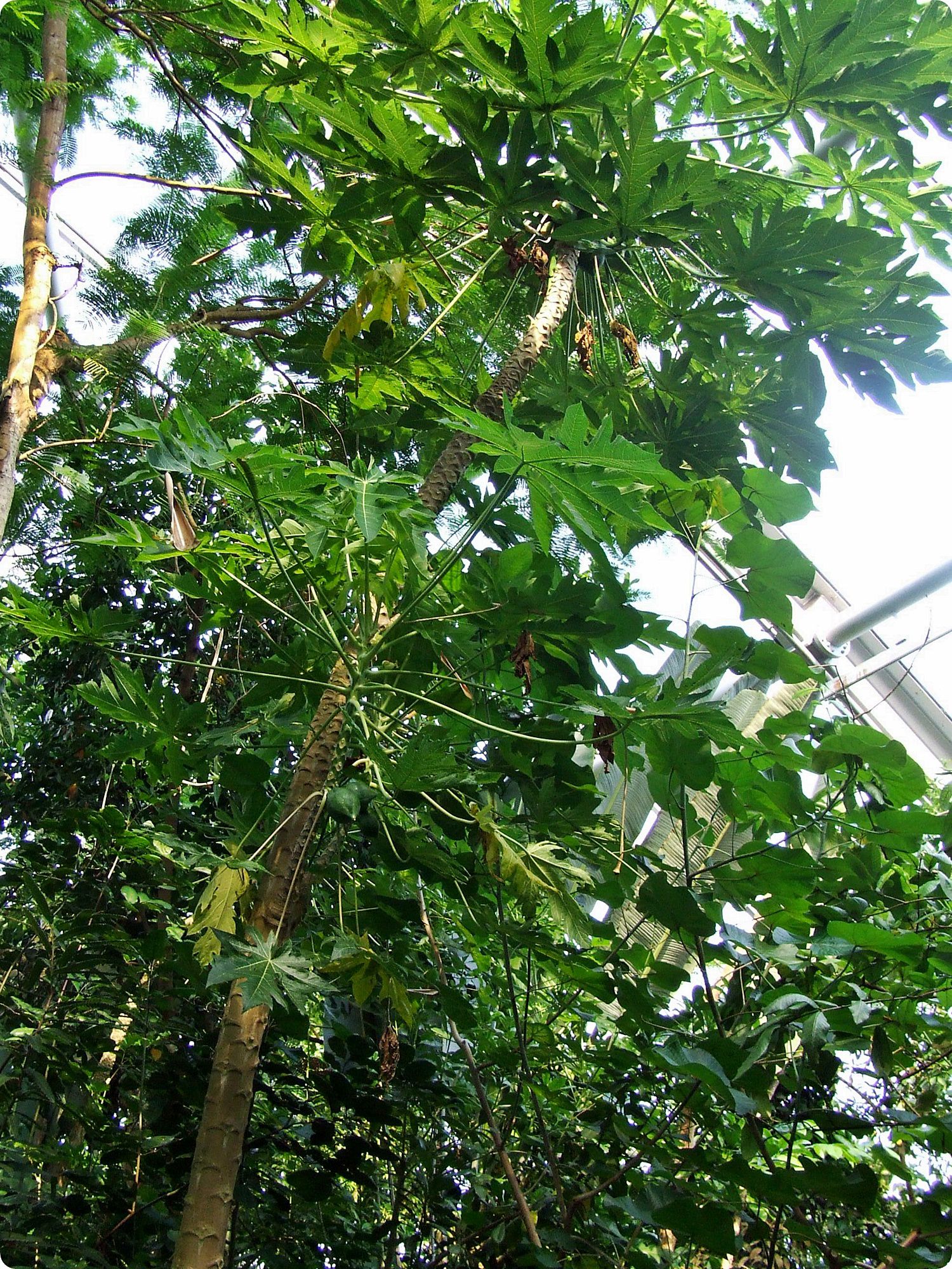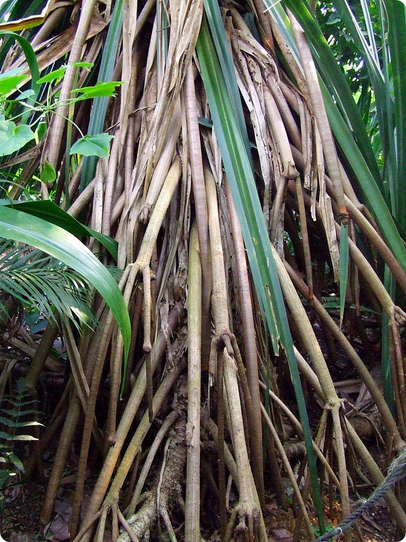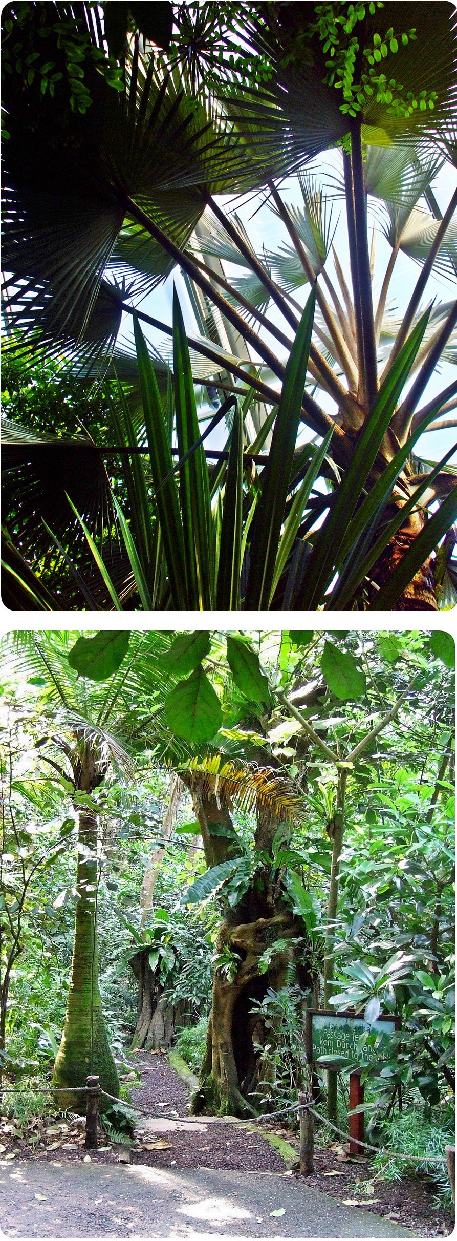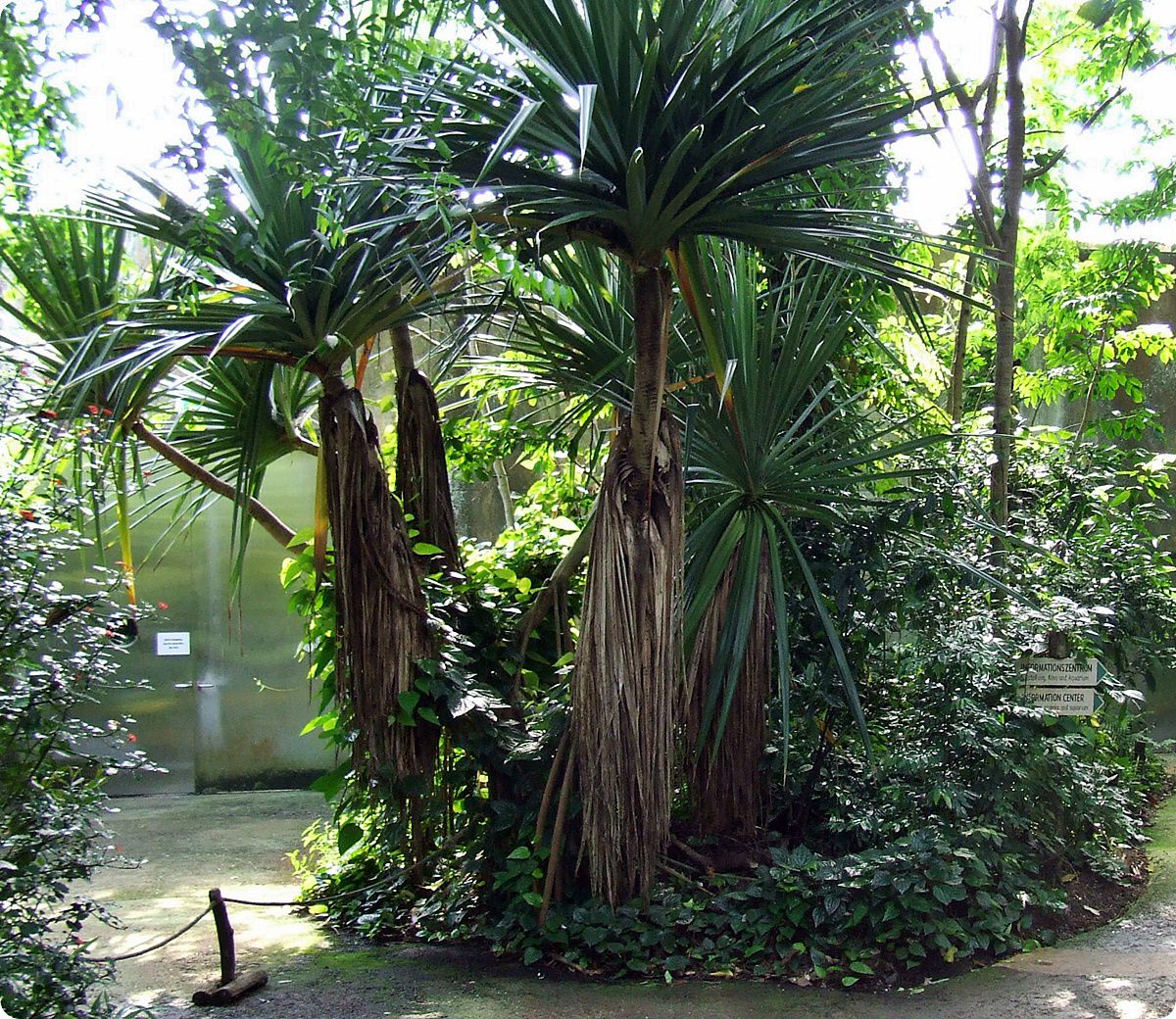 A csavarpálmák nagy tömegben képviseltetik magukat a csarnokban, hangulatosan övezve a látogatói útvonal számos szakaszát. Az alsó felvételen a Madagaszkáron előforduló faj, a Pandanus utilis, és annak szerteágazó támasztógyökerei láthatóak.