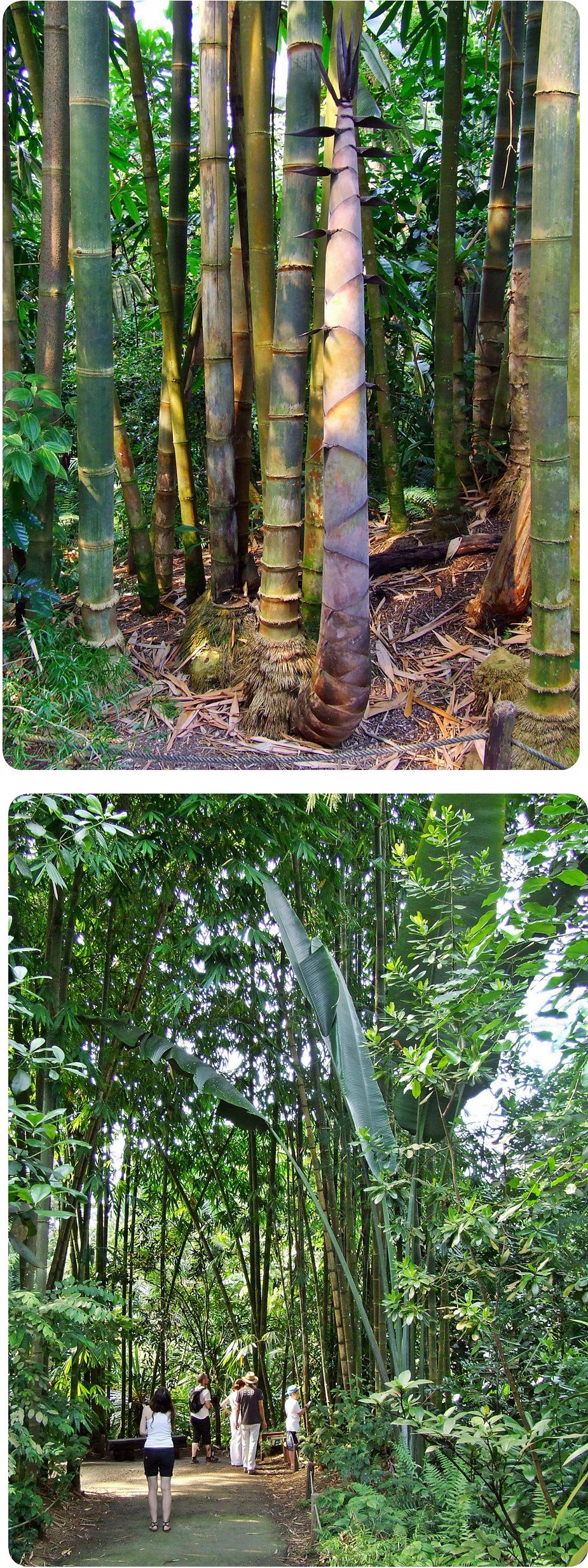 A fenti felvételeken Madagaszkár néhány endemikus pálmafaja látható. A közismert aranynád-pálma (balra) eleganciájának köszönhetően talán a legszélesebb körben, és cserepes dísznövényként a legnagyobb tételben értékesített pálmafaj világszerte, mely tevékenység egyre inkább csökkenő populációméreteket okoz a természetes élőhelyen. Míg a Dypsis-nemzetségbe számos fajt sorolnak, a Bismarck-pálma (jobbra fent) monotipikus taxonnak tekinthető. A veszélyeztetett, ám dísznövényként szintén kedvelt Ravenea rivularis (jobbra lent) orsó alakú „törzse” a fotó bal oldalán látható.