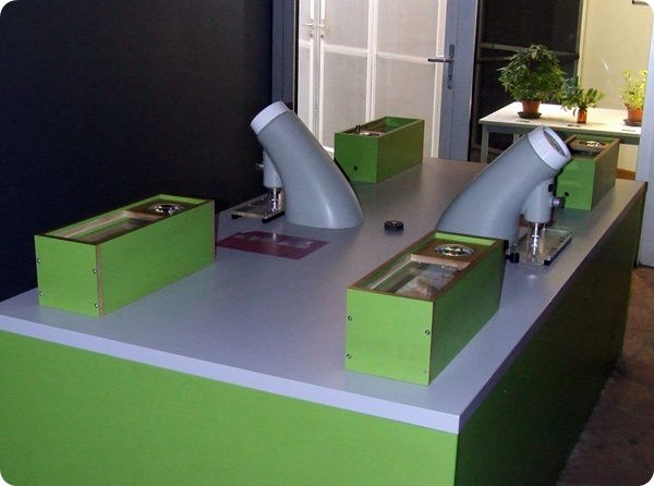 Felnagyított modellek (balra), "Lepkelaboratórium" (jobbra)